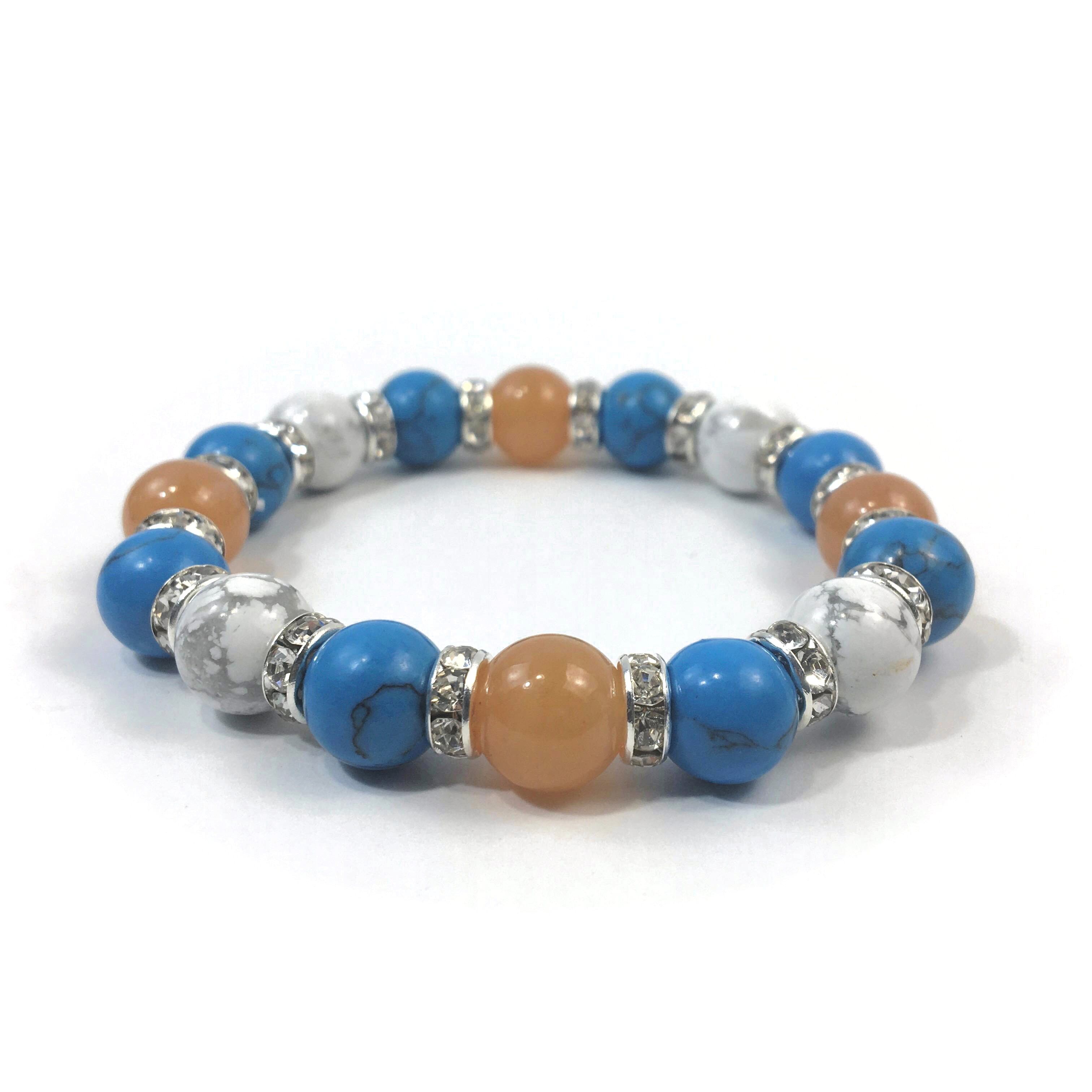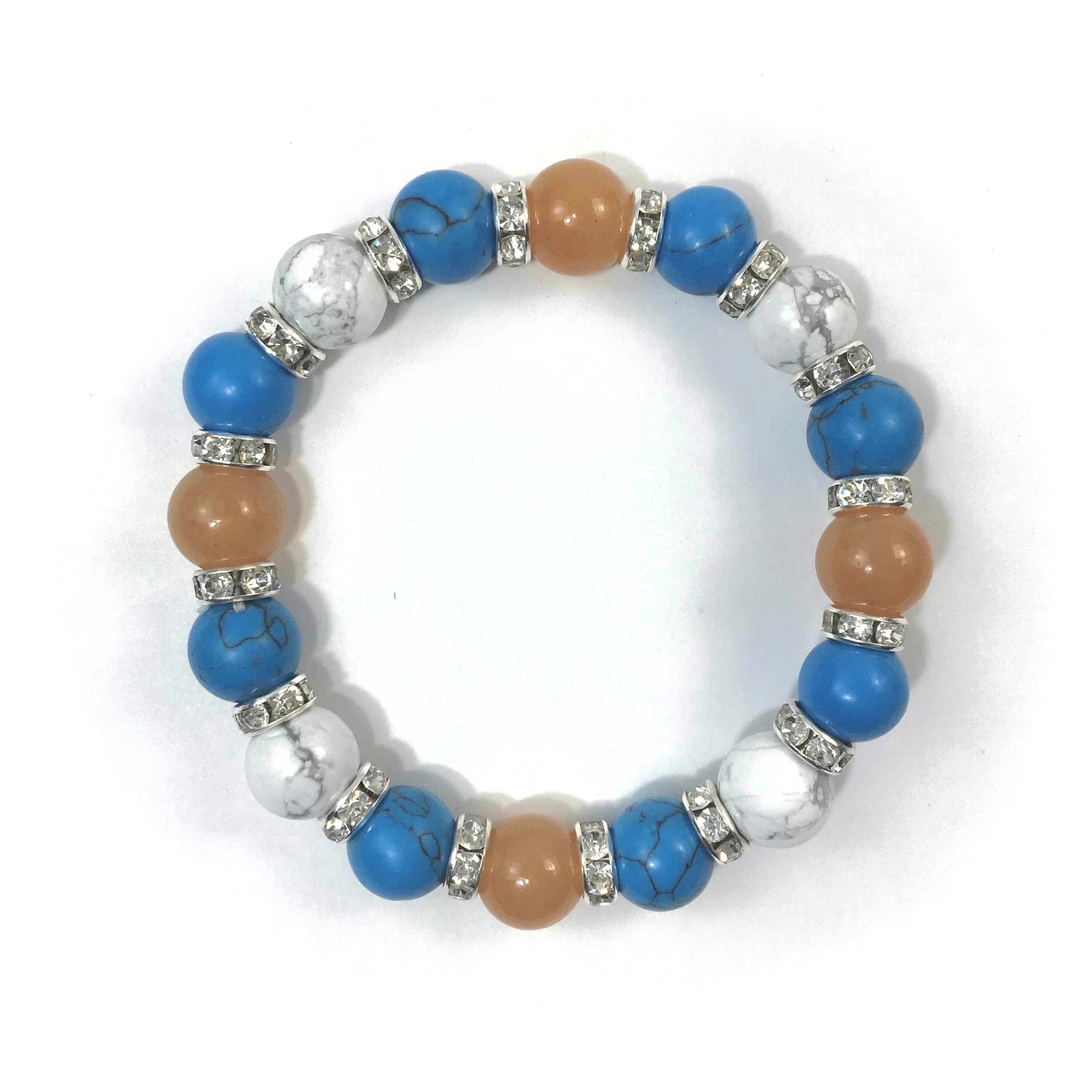 こちらは、レッドアベンチュリンとハウライトとターコイズを組み合わせたブレスレットです。間にはロンデルを挟み高級感あるデザインに仕上がっています。石大きさは腕にも馴染みやすいように10mm玉で内周約16cmです。数に限りがございますので気になる方はお早めにどうぞ。
