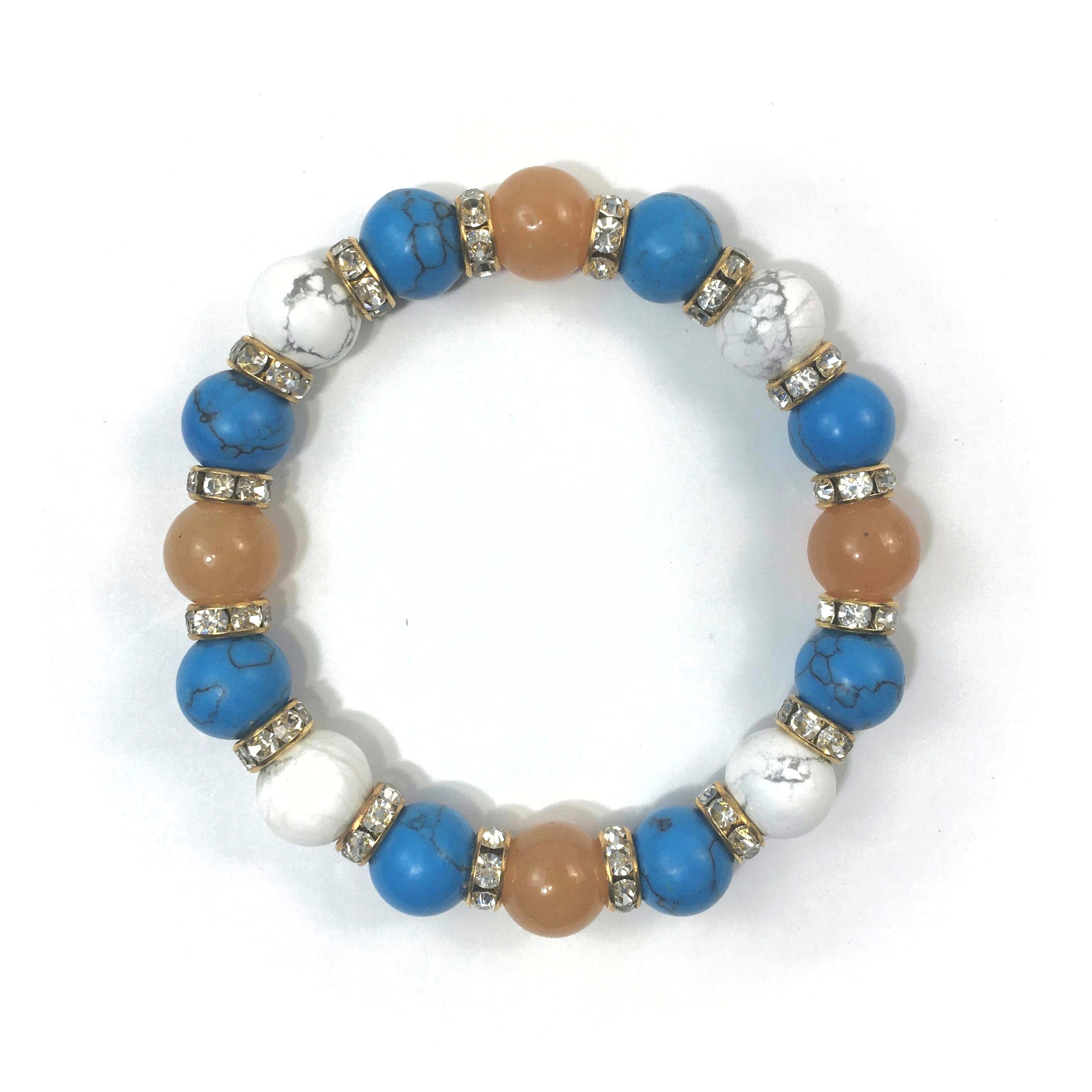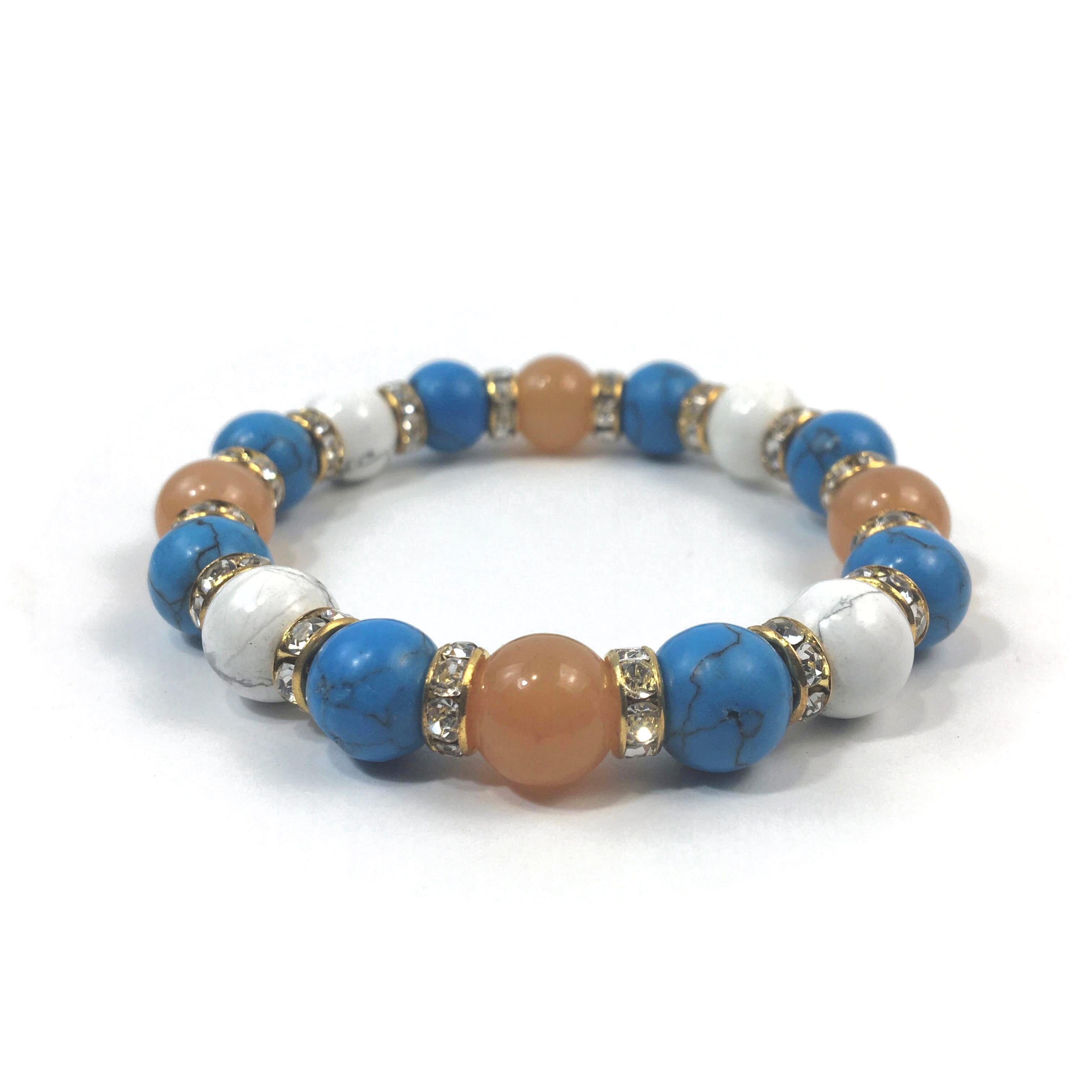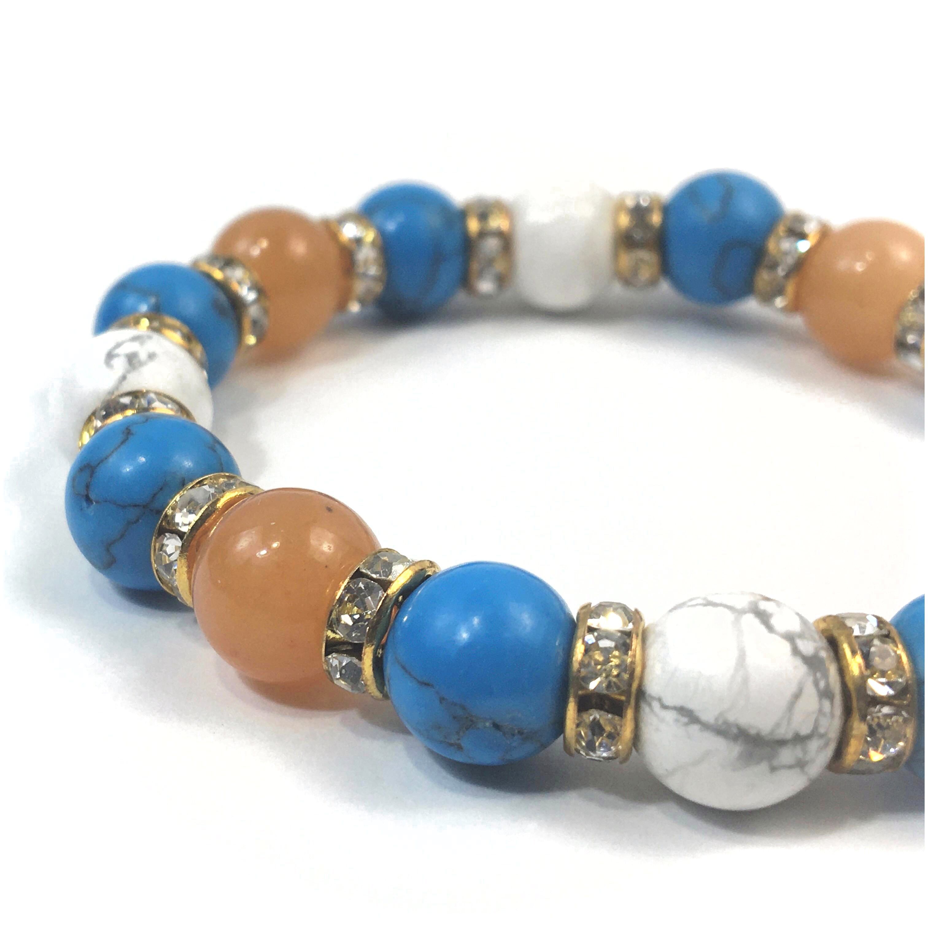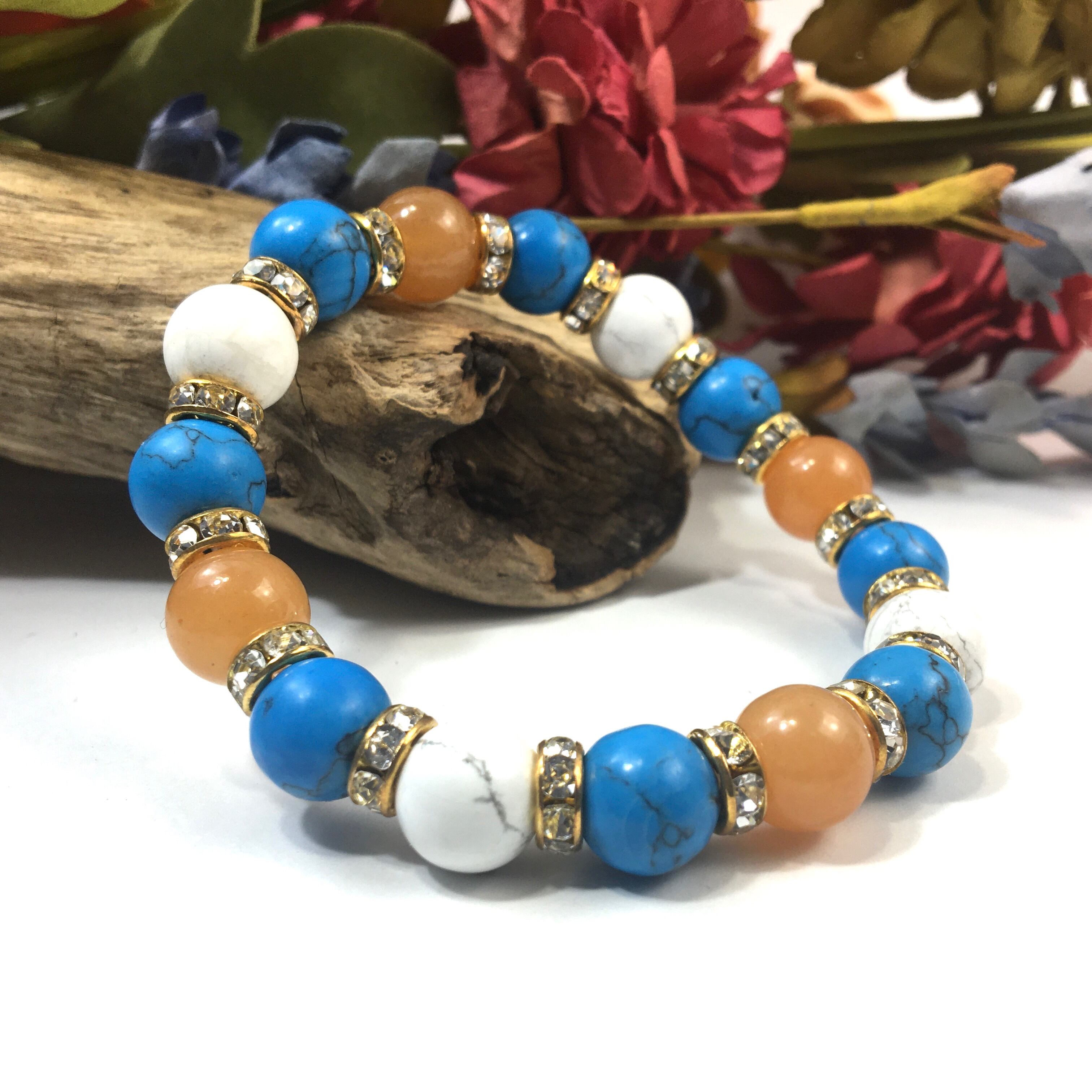こちらは、レッドアベンチュリンとハウライトとターコイズを組み合わせたブレスレットです。間にはロンデルを挟み高級感あるデザインに仕上がっています。石大きさは腕にも馴染みやすいように10mm玉で内周約16cmです。数に限りがございますので気になる方はお早めにどうぞ。