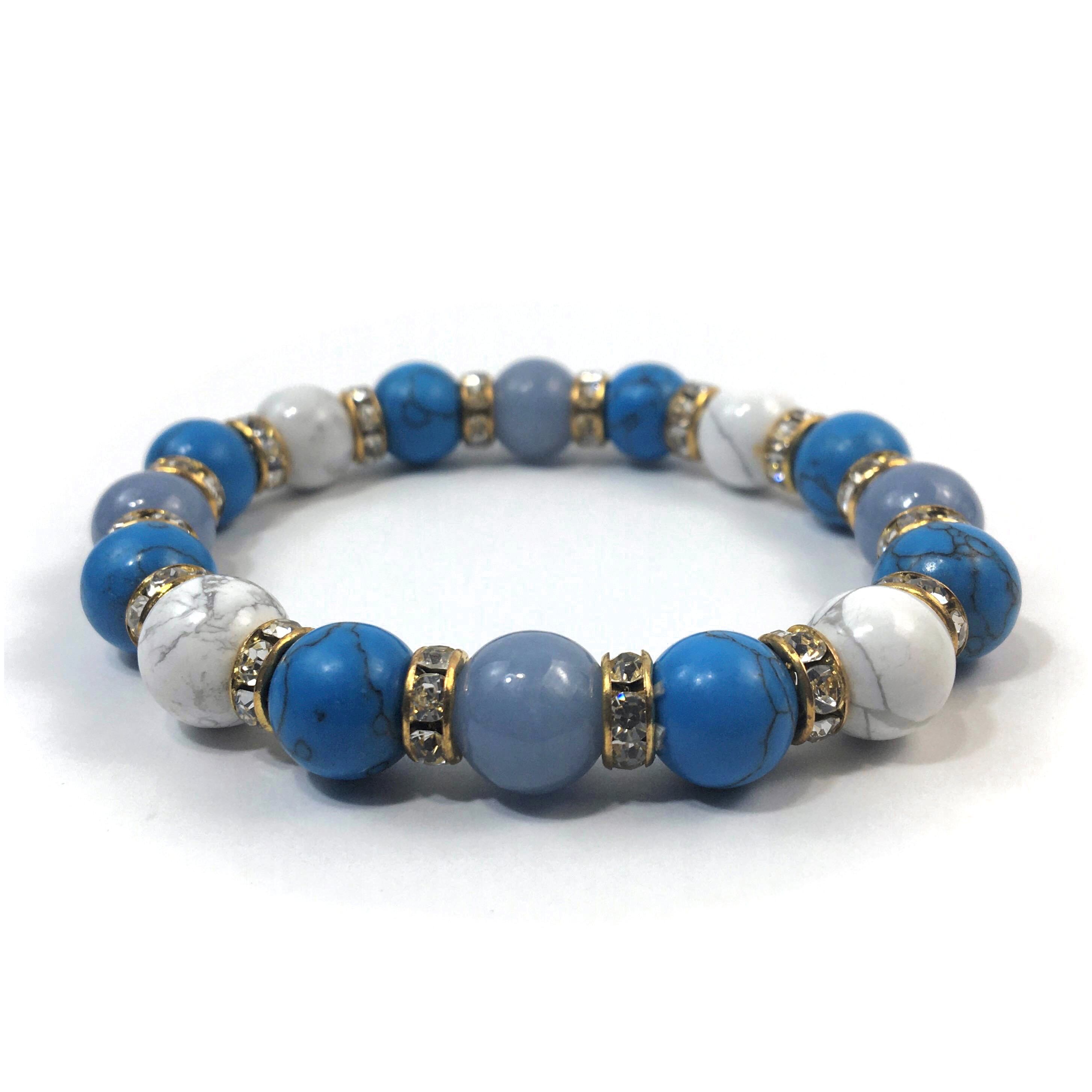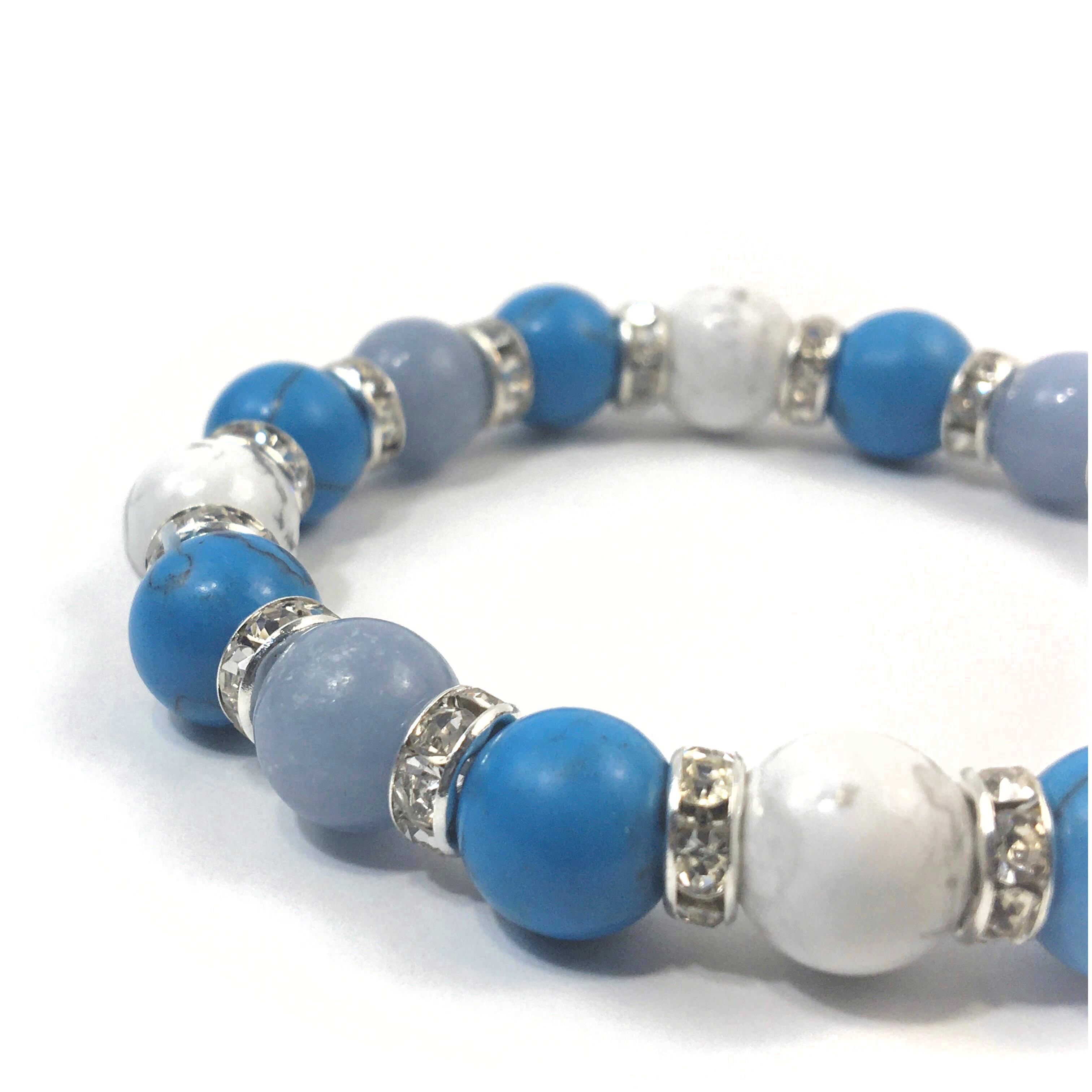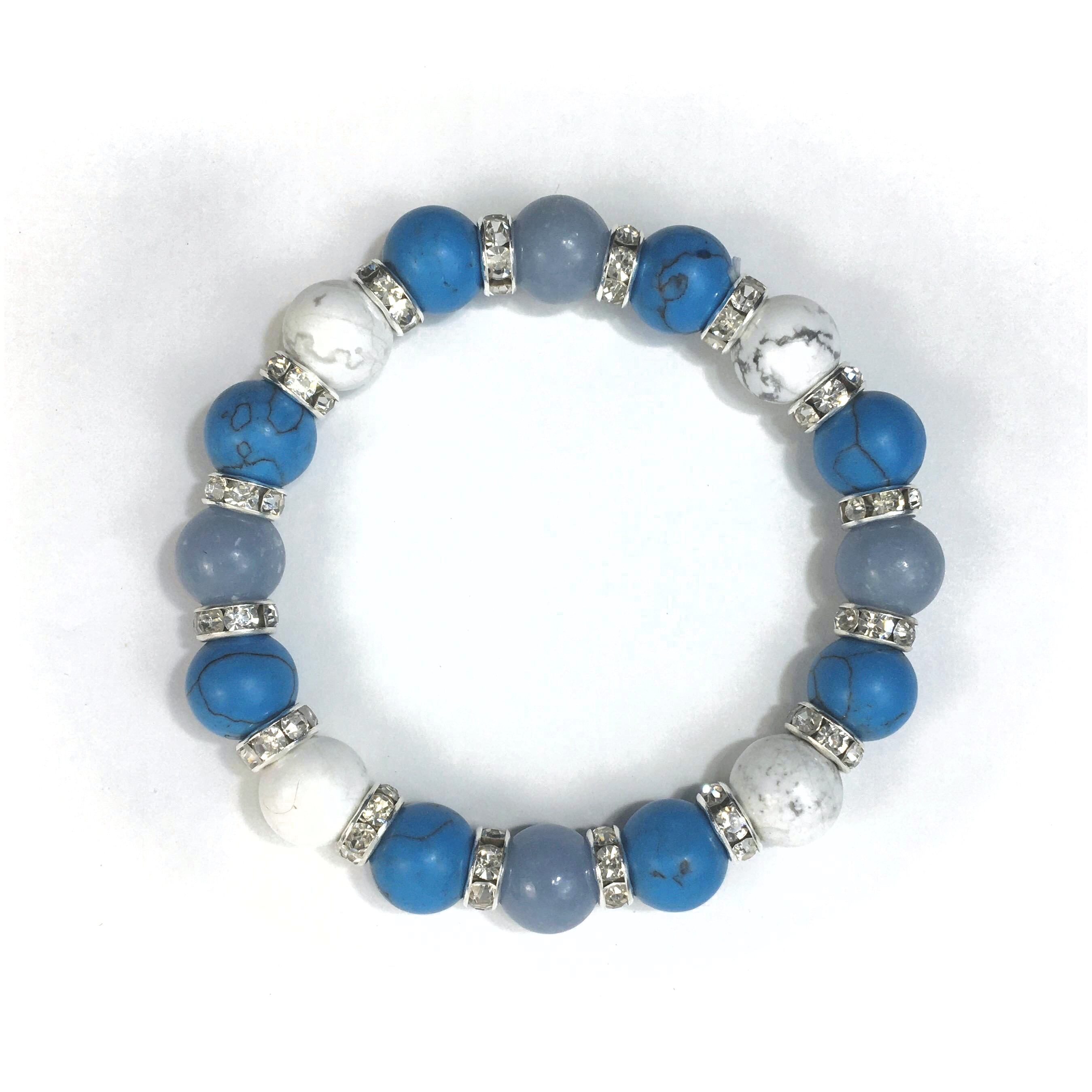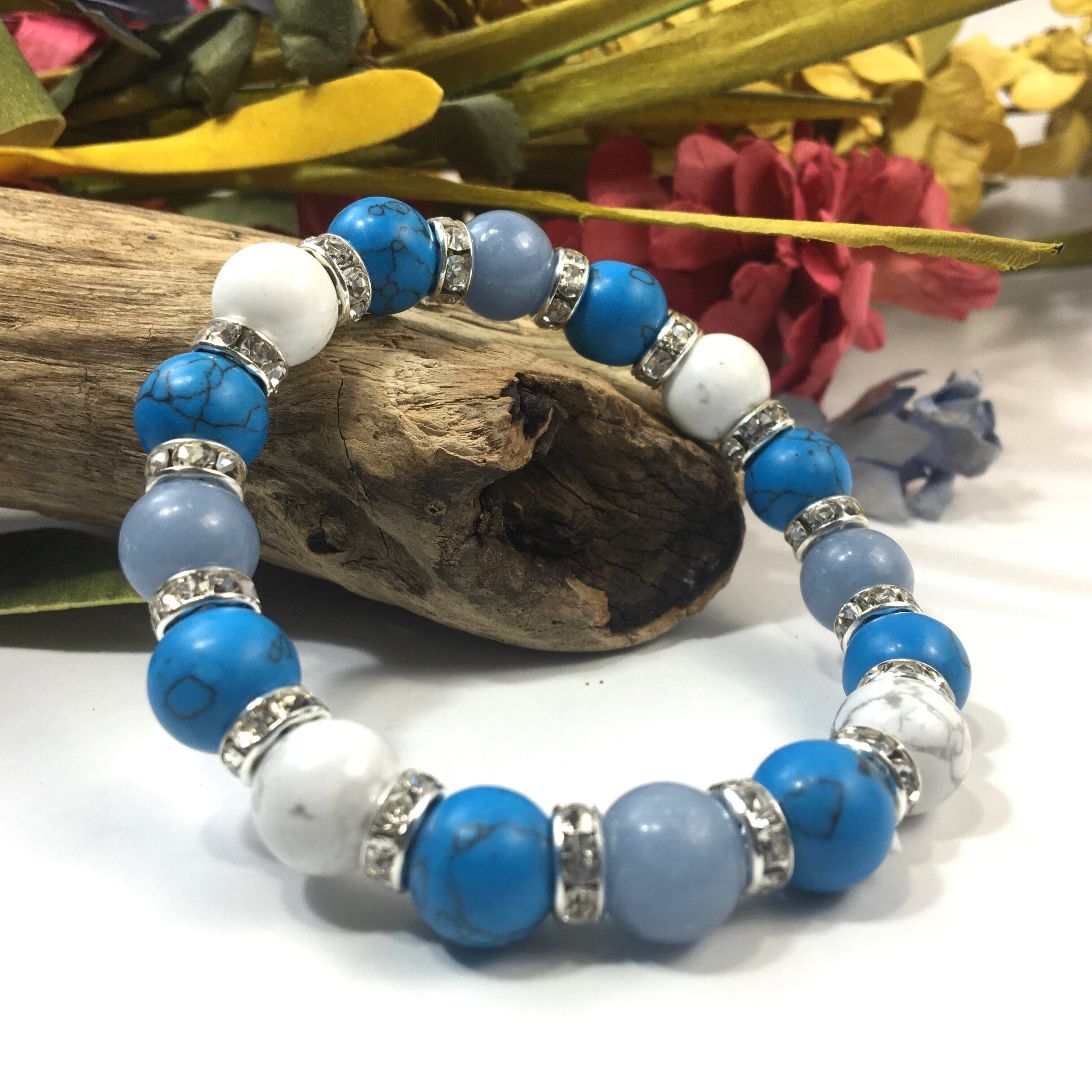 こちらは、エンジェライトとハウライトとターコイズを組み合わせたブレスレットです。間にはロンデルを挟み高級感あるデザインに仕上がっています。石大きさは腕にも馴染みやすいように10mm玉で内周約16cmです。数に限りがございますので気になる方はお早めにどうぞ。