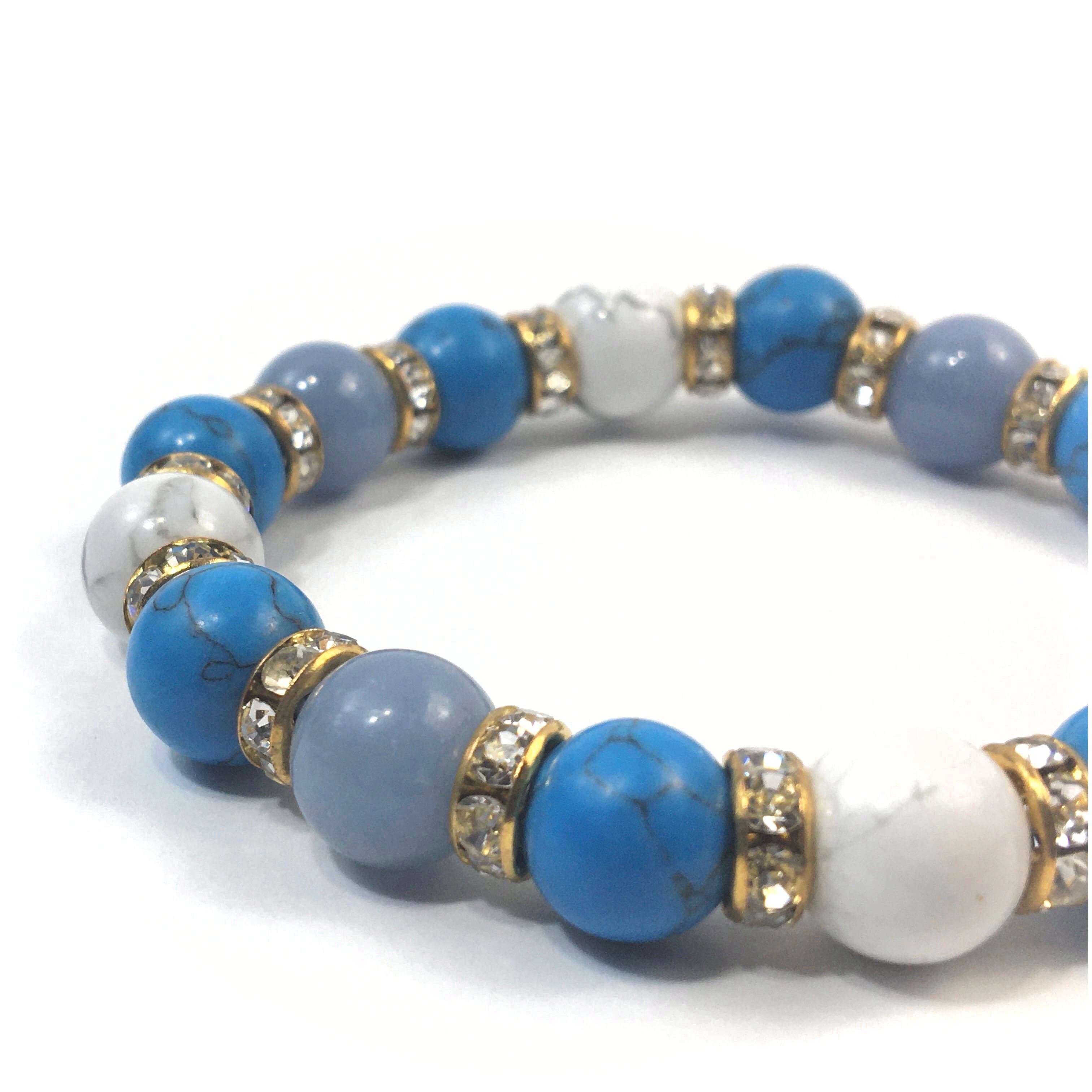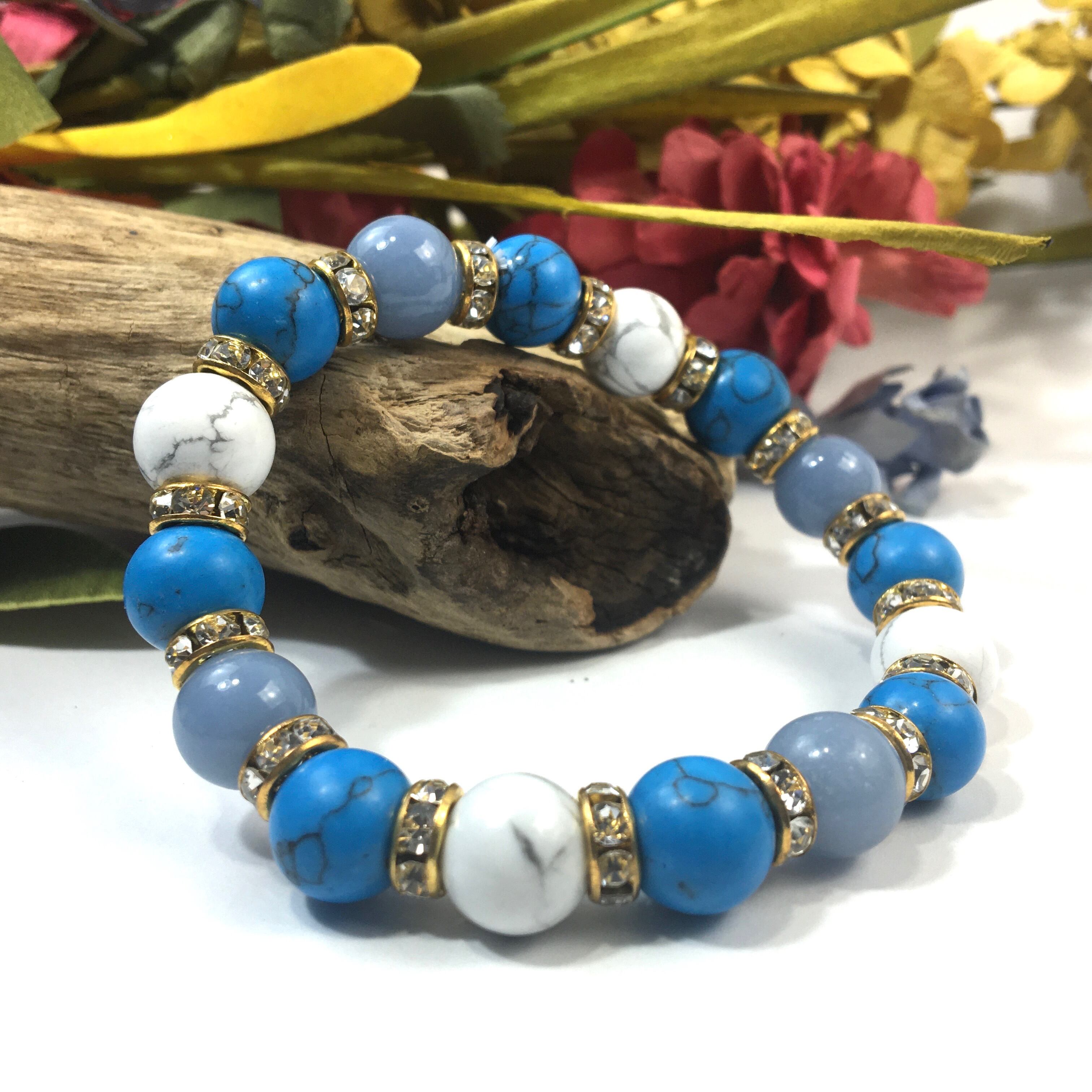 こちらは、エンジェライトとハウライトとターコイズを組み合わせたブレスレットです。間にはロンデルを挟み高級感あるデザインに仕上がっています。石大きさは腕にも馴染みやすいように10mm玉で内周約16cmです。数に限りがございますので気になる方はお早めにどうぞ。