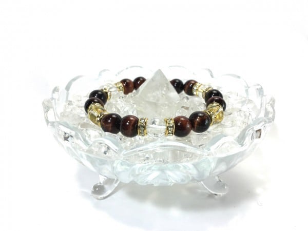 こちらは、レッドタイガーアイと水晶を組み合わせたブレスレットです。間にはロンデルを挟み高級感あるデザインに仕上がっています。石大きさは腕にも馴染みやすいように10mm玉で内周約17cm(伸可能)です。数に限りがございますので気になる方はお早めにどうぞ。