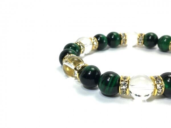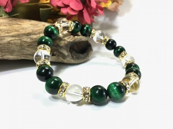 こちらは、グリーンタイガーアイと水晶を組み合わせたブレスレットです。間にはロンデルを挟み高級感あるデザインに仕上がっています。石大きさは腕にも馴染みやすいように10mm玉で内周約17cm(伸可能)です。数に限りがございますので気になる方はお早めにどうぞ。