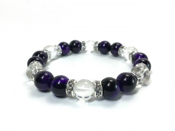 こちらは、パープルタイガーアイと水晶を組み合わせたブレスレットです。間にはロンデルを挟み高級感あるデザインに仕上がっています。石大きさは腕にも馴染みやすいように10mm玉で内周約17cm(伸可能)です。数に限りがございますので気になる方はお早めにどうぞ。