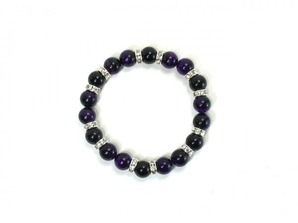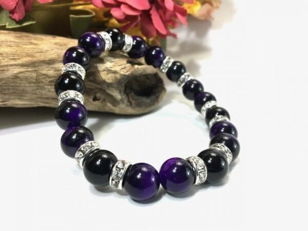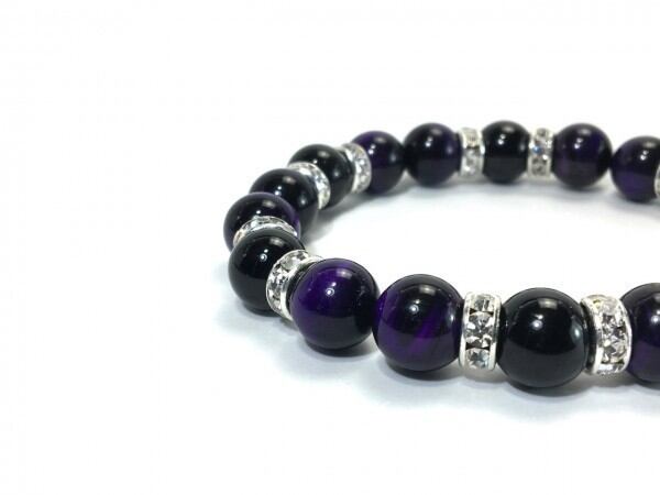 こちらは、パープルタイガーアイとオニキスを組み合わせたブレスレットです。間にはロンデルを挟み高級感あるデザインに仕上がっています。石大きさは腕にも馴染みやすいように10mm玉で内周約17cm(伸可能)です。数に限りがございますので気になる方はお早めにどうぞ。