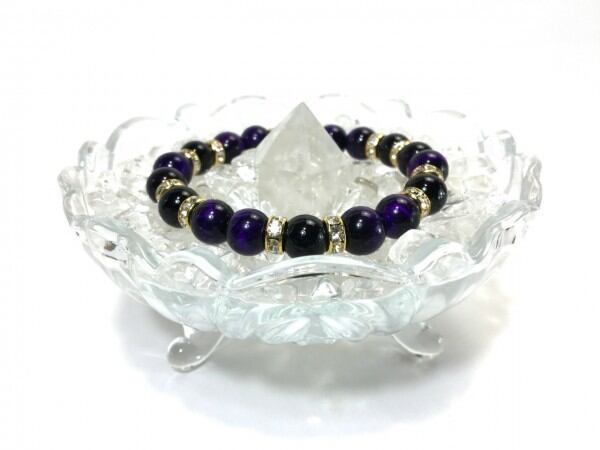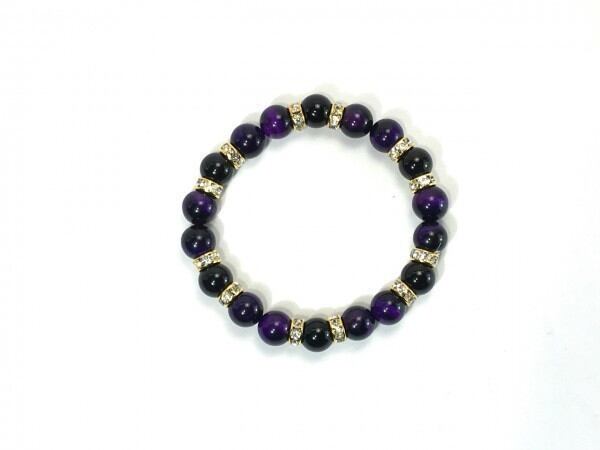 こちらは、パープルタイガーアイとオニキスを組み合わせたブレスレットです。間にはロンデルを挟み高級感あるデザインに仕上がっています。石大きさは腕にも馴染みやすいように10mm玉で内周約17cm(伸可能)です。数に限りがございますので気になる方はお早めにどうぞ。