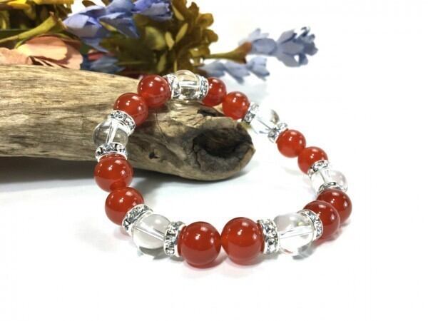 こちらは、赤瑪瑙と水晶を組み合わせたブレスレットです。間にはロンデルを挟み高級感あるデザインに仕上がっています。石大きさは腕にも馴染みやすいように10mm玉で内周約17cm(伸可能)です。数に限りがございますので気になる方はお早めにどうぞ。