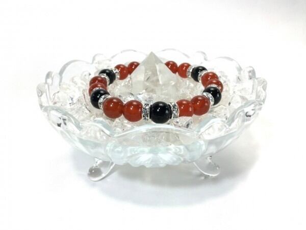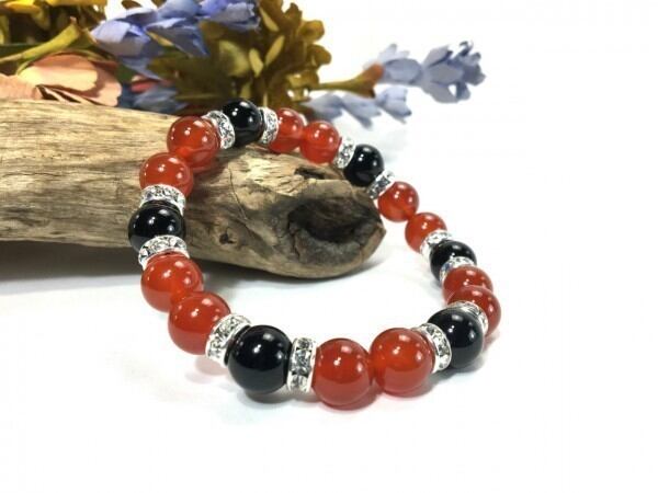 こちらは、赤瑪瑙とオニキスを組み合わせたブレスレットです。間にはロンデルを挟み高級感あるデザインに仕上がっています。石大きさは腕にも馴染みやすいように10mm玉で内周約17cm(伸可能)です。数に限りがございますので気になる方はお早めにどうぞ。