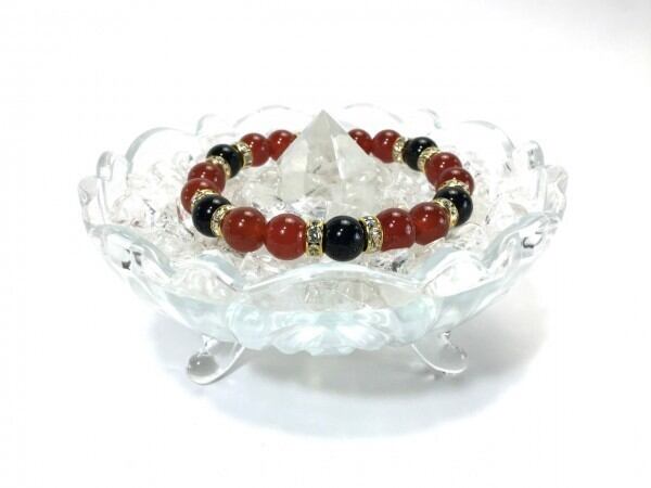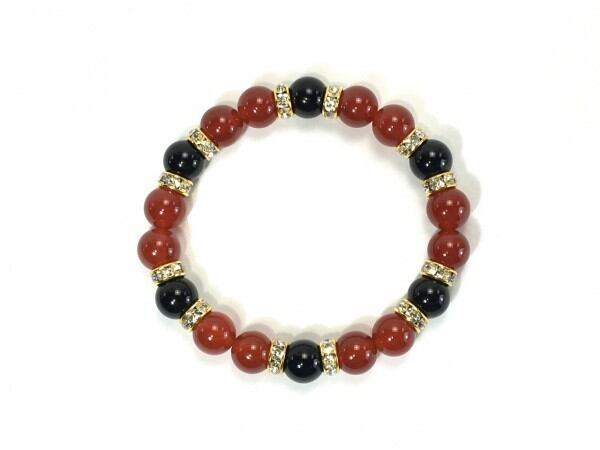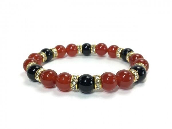 こちらは、赤瑪瑙とオニキスを組み合わせたブレスレットです。間にはロンデルを挟み高級感あるデザインに仕上がっています。石大きさは腕にも馴染みやすいように10mm玉で内周約17cm(伸可能)です。数に限りがございますので気になる方はお早めにどうぞ。