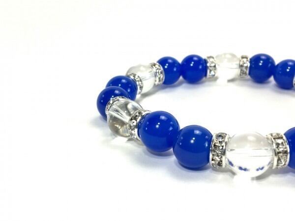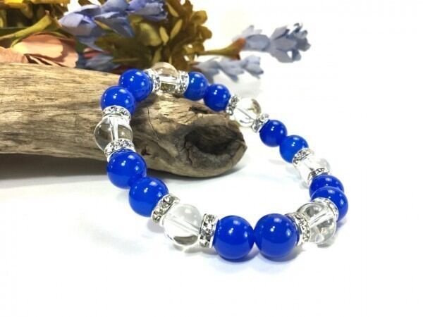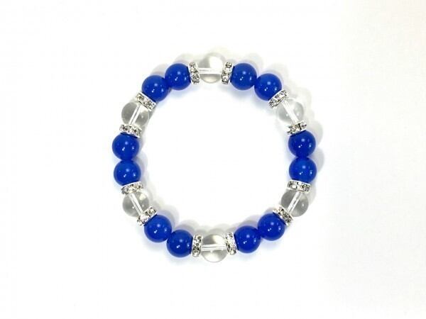 こちらは、ブルーメノウと水晶を組み合わせたブレスレットです。間にはロンデルを挟み高級感あるデザインに仕上がっています。石大きさは腕にも馴染みやすいように10mm玉で内周約17cm(伸可能)です。数に限りがございますので気になる方はお早めにどうぞ。