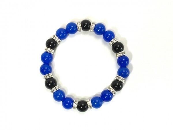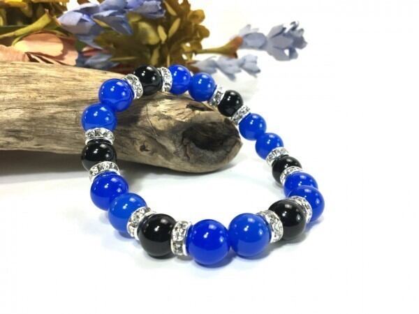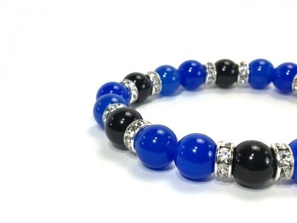 こちらは、ブルーメノウとオニキスを組み合わせたブレスレットです。間にはロンデルを挟み高級感あるデザインに仕上がっています。石大きさは腕にも馴染みやすいように10mm玉で内周約17cm(伸可能)です。数に限りがございますので気になる方はお早めにどうぞ。