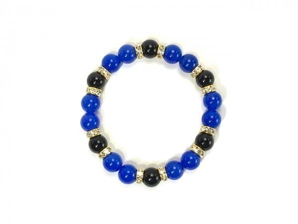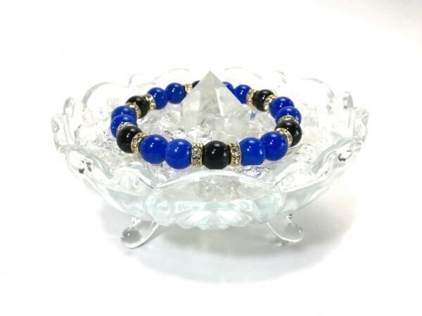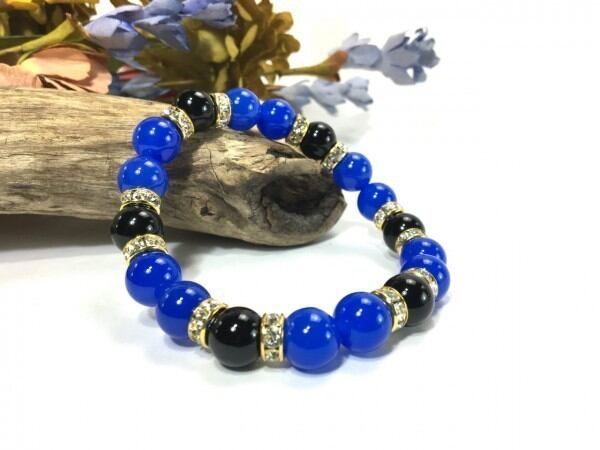 こちらは、ブルーメノウとオニキスを組み合わせたブレスレットです。間にはロンデルを挟み高級感あるデザインに仕上がっています。石大きさは腕にも馴染みやすいように10mm玉で内周約17cm(伸可能)です。数に限りがございますので気になる方はお早めにどうぞ。