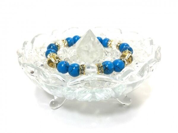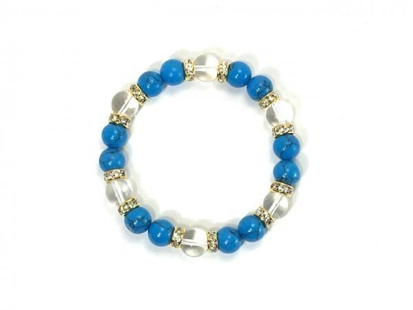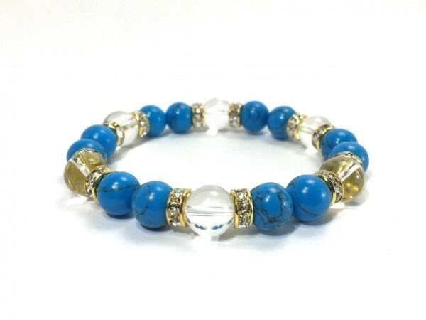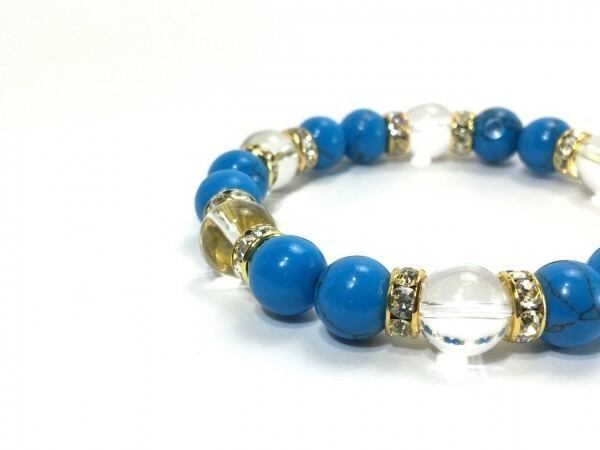 こちらは、ターコイズと水晶を組み合わせたブレスレットです。間にはロンデルを挟み高級感あるデザインに仕上がっています。石大きさは腕にも馴染みやすいように10mm玉で内周約17cm(伸可能)です。数に限りがございますので気になる方はお早めにどうぞ。