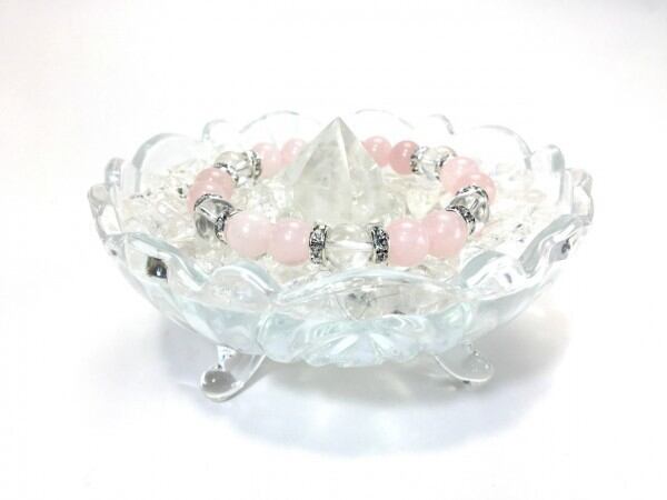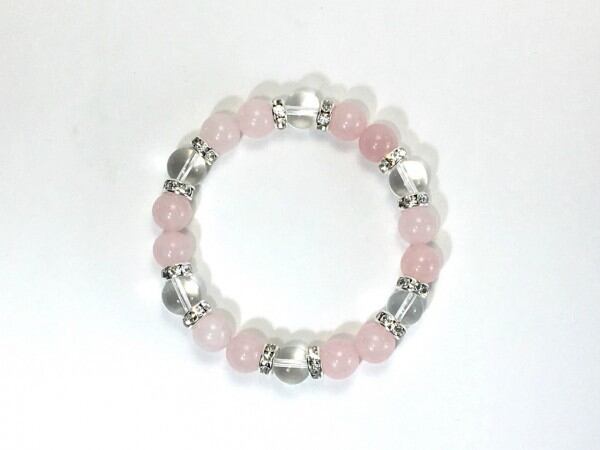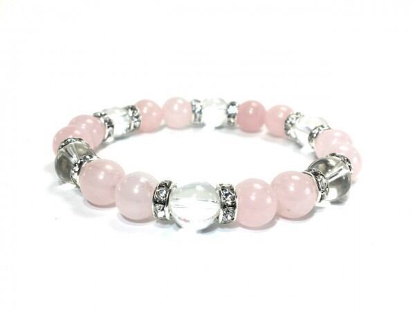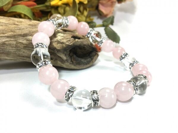 こちらは、ローズクォーツと水晶を組み合わせたブレスレットです。間にはロンデルを挟み高級感あるデザインに仕上がっています。石大きさは腕にも馴染みやすいように10mm玉で内周約17cm(伸可能)です。数に限りがございますので気になる方はお早めにどうぞ。