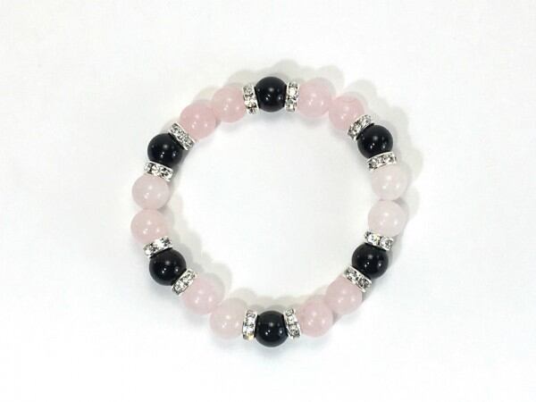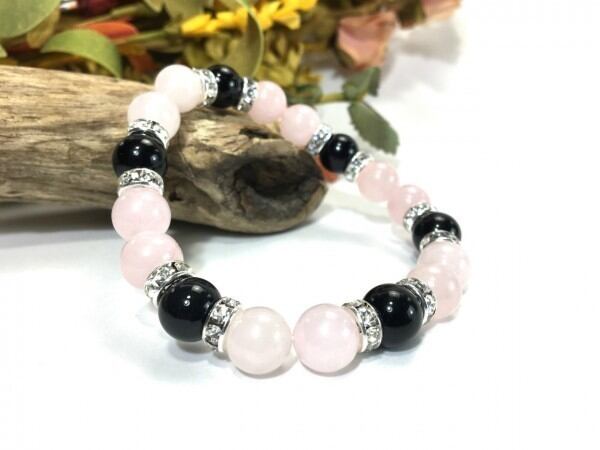 こちらは、ローズクォーツとオニキスを組み合わせたブレスレットです。間にはロンデルを挟み高級感あるデザインに仕上がっています。石大きさは腕にも馴染みやすいように10mm玉で内周約17cm(伸可能)です。数に限りがございますので気になる方はお早めにどうぞ。