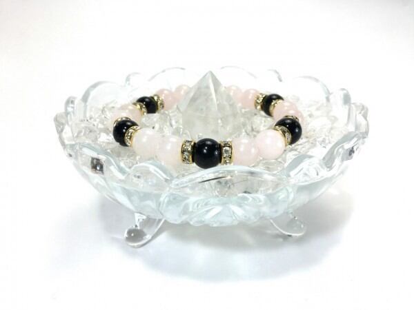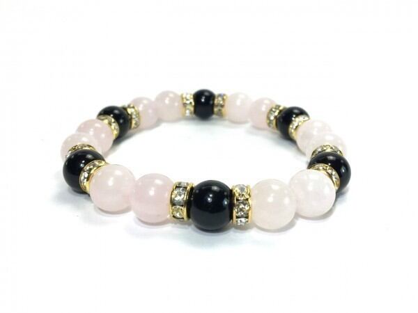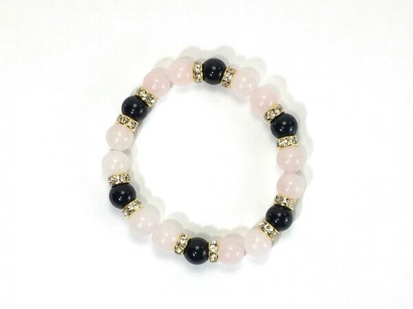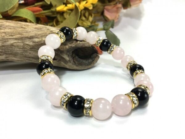 こちらは、ローズクォーツとオニキスを組み合わせたブレスレットです。間にはロンデルを挟み高級感あるデザインに仕上がっています。石大きさは腕にも馴染みやすいように10mm玉で内周約17cm(伸可能)です。数に限りがございますので気になる方はお早めにどうぞ。