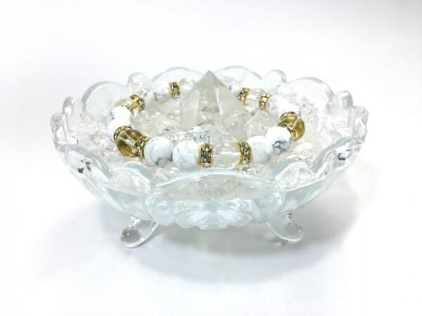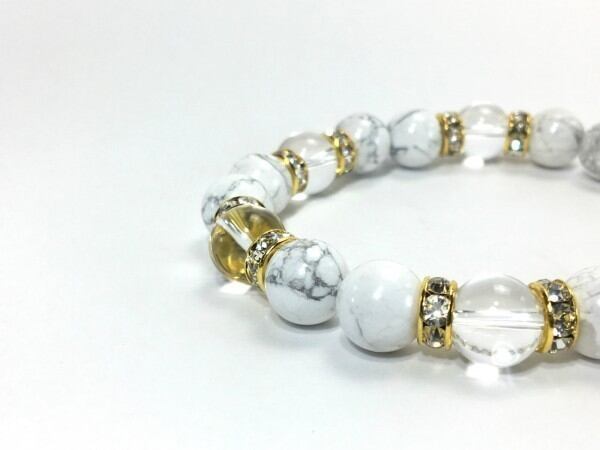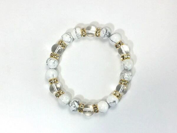 こちらは、ハウライトと水晶を組み合わせたブレスレットです。間にはロンデルを挟み高級感あるデザインに仕上がっています。石大きさは腕にも馴染みやすいように10mm玉で内周約17cm(伸可能)です。数に限りがございますので気になる方はお早めにどうぞ。