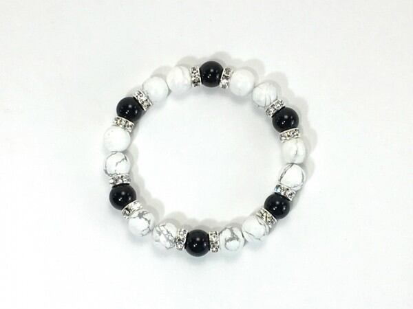 こちらは、ハウライトとオニキスを組み合わせたブレスレットです。間にはロンデルを挟み高級感あるデザインに仕上がっています。石大きさは腕にも馴染みやすいように10mm玉で内周約17cm(伸可能)です。数に限りがございますので気になる方はお早めにどうぞ。
