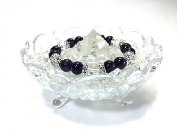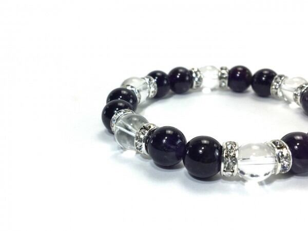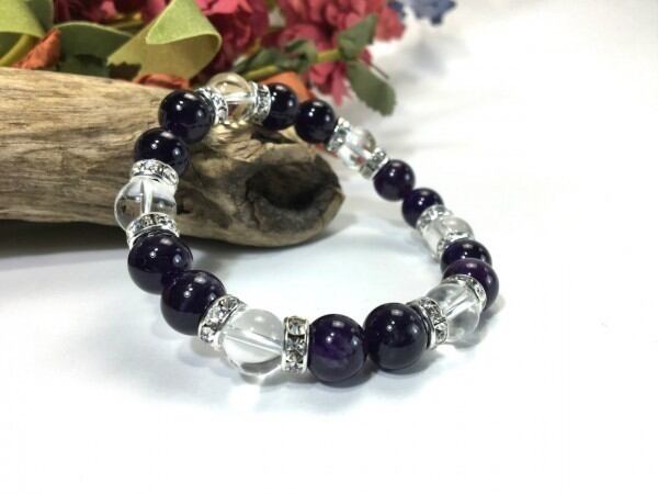 こちらは、アメジストと水晶を組み合わせたブレスレットです。間にはロンデルを挟み高級感あるデザインに仕上がっています。石大きさは腕にも馴染みやすいように10mm玉で内周約17cm(伸可能)です。数に限りがございますので気になる方はお早めにどうぞ。