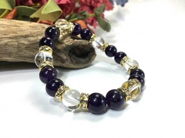 こちらは、アメジストと水晶を組み合わせたブレスレットです。間にはロンデルを挟み高級感あるデザインに仕上がっています。石大きさは腕にも馴染みやすいように10mm玉で内周約17cm(伸可能)です。数に限りがございますので気になる方はお早めにどうぞ。