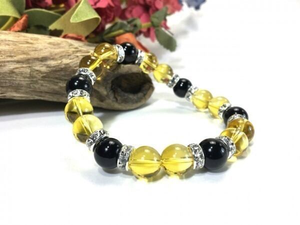 こちらは、シトリンとオニキスを組み合わせたブレスレットです。間にはロンデルを挟み高級感あるデザインに仕上がっています。石大きさは腕にも馴染みやすいように10mm玉で内周約17cm(伸可能)です。数に限りがございますので気になる方はお早めにどうぞ。