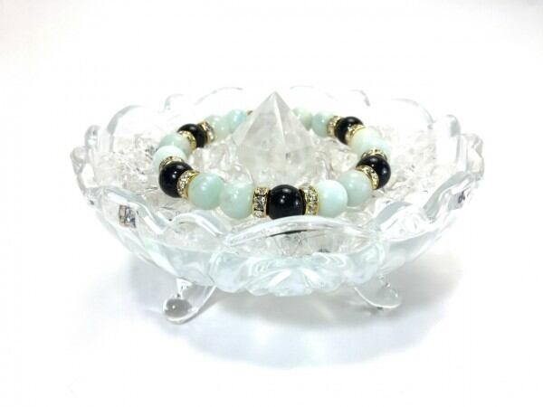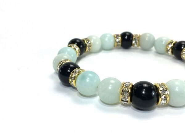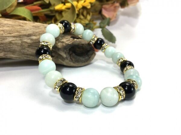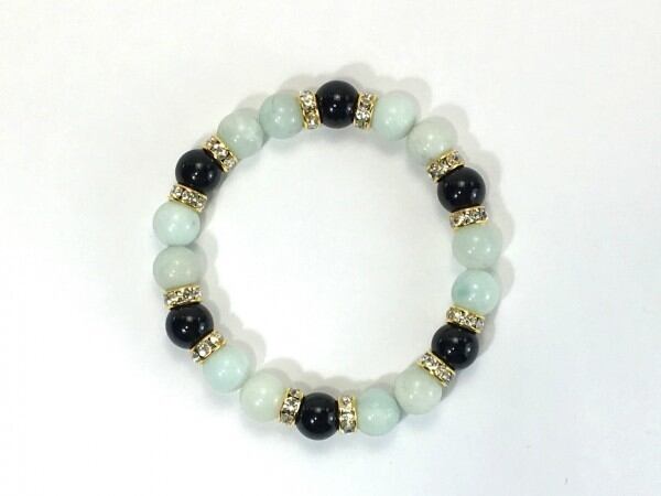 こちらは、アマゾナイトとオニキスを組み合わせたブレスレットです。間にはロンデルを挟み高級感あるデザインに仕上がっています。石大きさは腕にも馴染みやすいように10mm玉で内周約17cm(伸可能)です。数に限りがございますので気になる方はお早めにどうぞ。