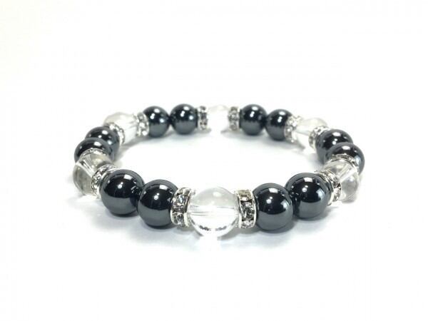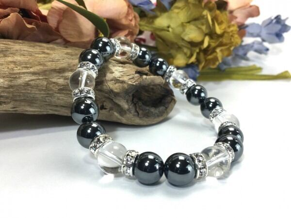 こちらは、ヘマタイトと水晶を組み合わせたブレスレットです。間にはロンデルを挟み高級感あるデザインに仕上がっています。石大きさは腕にも馴染みやすいように10mm玉で内周約17cm(伸可能)です。数に限りがございますので気になる方はお早めにどうぞ。