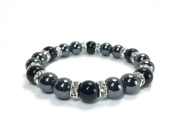 こちらは、ヘマタイトとオニキスを組み合わせたブレスレットです。間にはロンデルを挟み高級感あるデザインに仕上がっています。石大きさは腕にも馴染みやすいように10mm玉で内周約17cm(伸可能)です。数に限りがございますので気になる方はお早めにどうぞ。