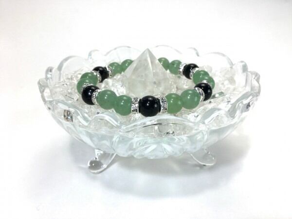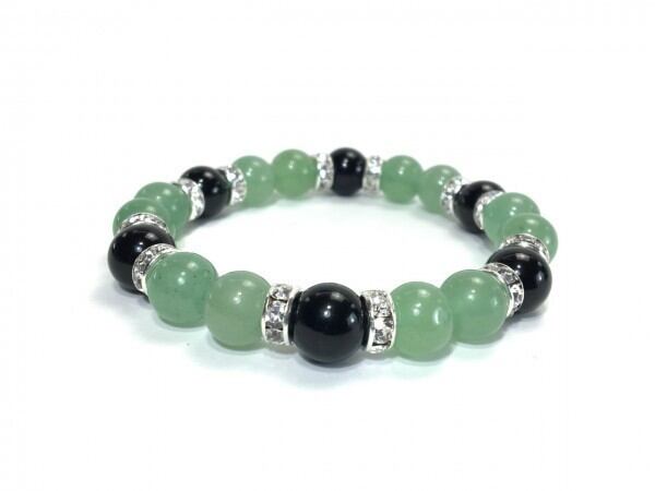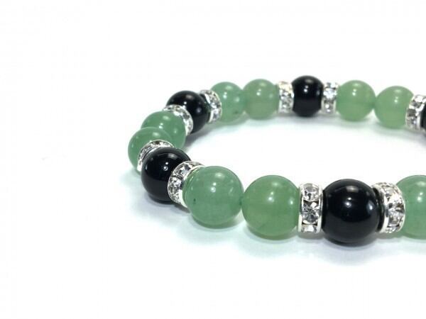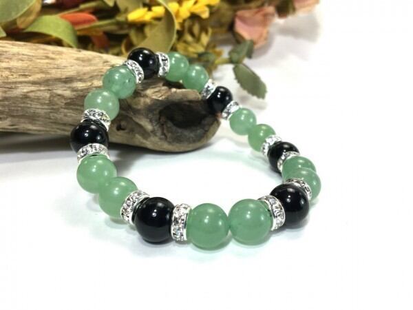こちらは、アベンチュリンとオニキスを組み合わせたブレスレットです。間にはロンデルを挟み高級感あるデザインに仕上がっています。石大きさは腕にも馴染みやすいように10mm玉で内周約17cm(伸可能)です。数に限りがございますので気になる方はお早めにどうぞ。