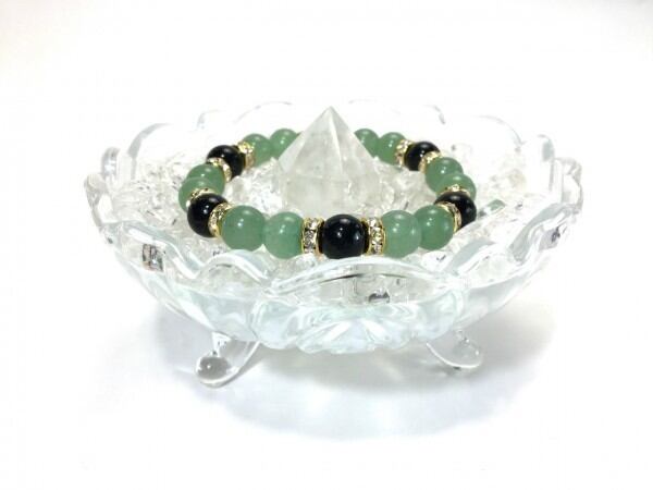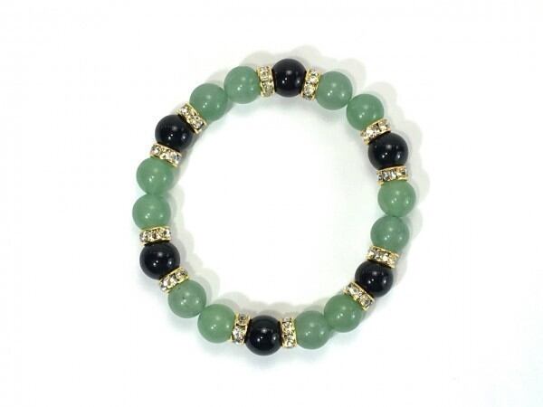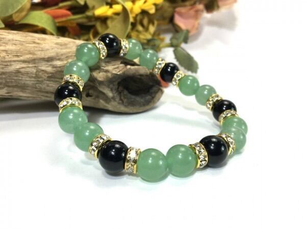 こちらは、アベンチュリンとオニキスを組み合わせたブレスレットです。間にはロンデルを挟み高級感あるデザインに仕上がっています。石大きさは腕にも馴染みやすいように10mm玉で内周約17cm(伸可能)です。数に限りがございますので気になる方はお早めにどうぞ。