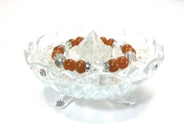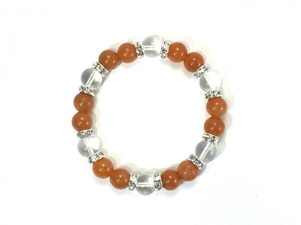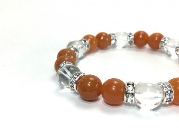 こちらは、レッドアベンチュリンと水晶を組み合わせたブレスレットです。間にはロンデルを挟み高級感あるデザインに仕上がっています。石大きさは腕にも馴染みやすいように10mm玉で内周約17cm(伸可能)です。数に限りがございますので気になる方はお早めにどうぞ。