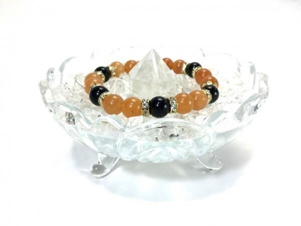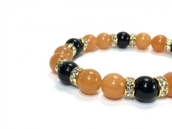 こちらは、レッドアベンチュリンとオニキスを組み合わせたブレスレットです。間にはロンデルを挟み高級感あるデザインに仕上がっています。石大きさは腕にも馴染みやすいように10mm玉で内周約17cm(伸可能)です。数に限りがございますので気になる方はお早めにどうぞ。