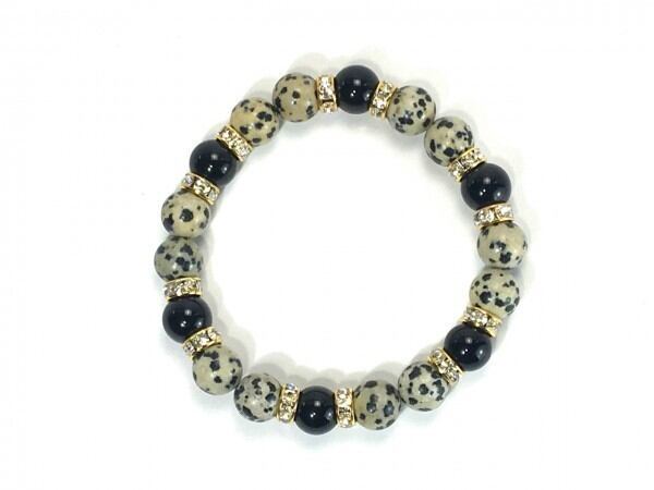 こちらは、ダルメシアンジャスパーとオニキスを組み合わせたブレスレットです。間にはロンデルを挟み高級感あるデザインに仕上がっています。石大きさは腕にも馴染みやすいように10mm玉で内周約17cm(伸可能)です。数に限りがございますので気になる方はお早めにどうぞ。