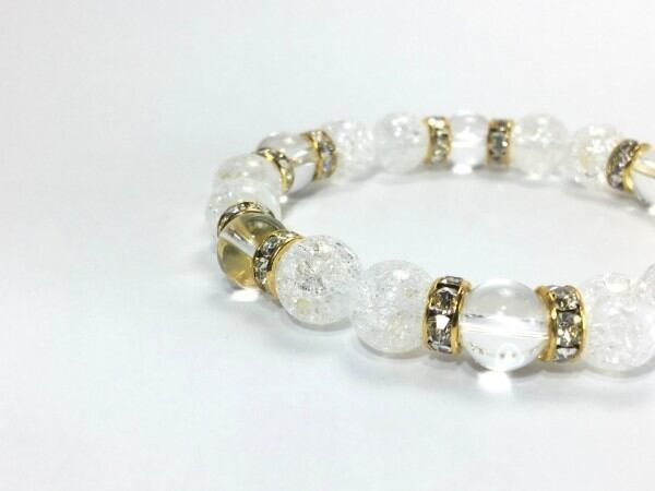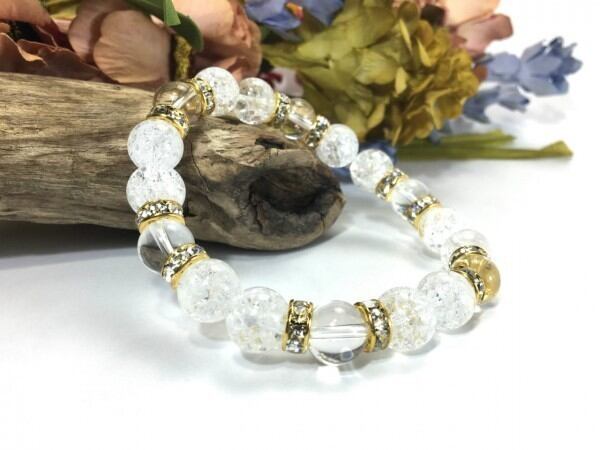 こちらは、クラック水晶と水晶を組み合わせたブレスレットです。間にはロンデルを挟み高級感あるデザインに仕上がっています。石大きさは腕にも馴染みやすいように10mm玉で内周約17cm(伸可能)です。数に限りがございますので気になる方はお早めにどうぞ。