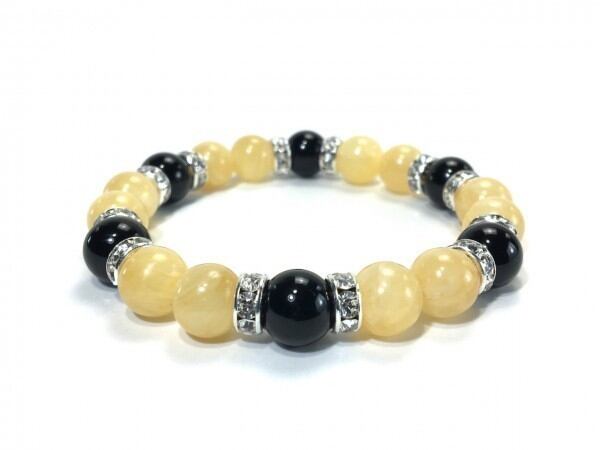 こちらは、アラゴナイトとオニキスを組み合わせたブレスレットです。間にはロンデルを挟み高級感あるデザインに仕上がっています。石大きさは腕にも馴染みやすいように10mm玉で内周約17cm(伸可能)です。数に限りがございますので気になる方はお早めにどうぞ。