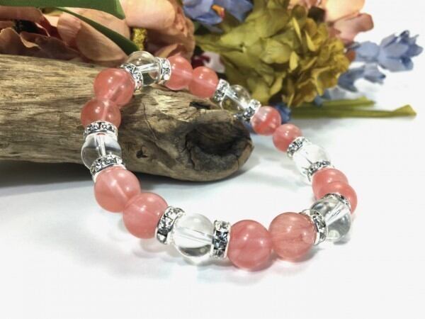こちらは、チェリークォーツと水晶を組み合わせたブレスレットです。間にはロンデルを挟み高級感あるデザインに仕上がっています。石大きさは腕にも馴染みやすいように10mm玉で内周約17cm(伸可能)です。数に限りがございますので気になる方はお早めにどうぞ。