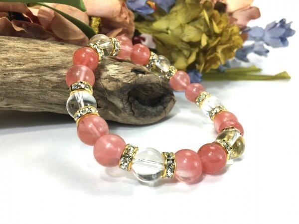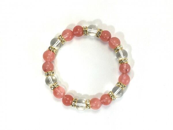 こちらは、チェリークォーツと水晶を組み合わせたブレスレットです。間にはロンデルを挟み高級感あるデザインに仕上がっています。石大きさは腕にも馴染みやすいように10mm玉で内周約17cm(伸可能)です。数に限りがございますので気になる方はお早めにどうぞ。