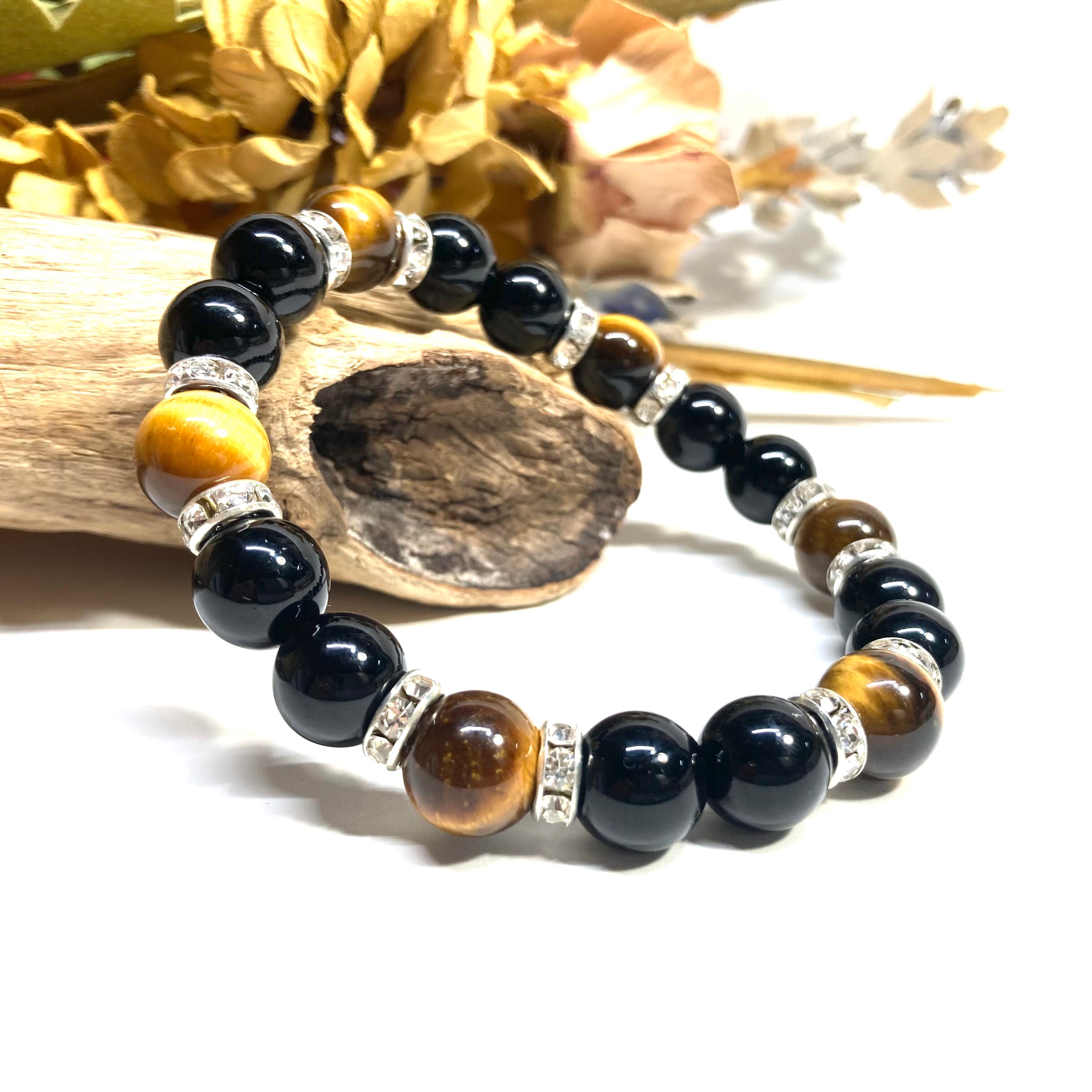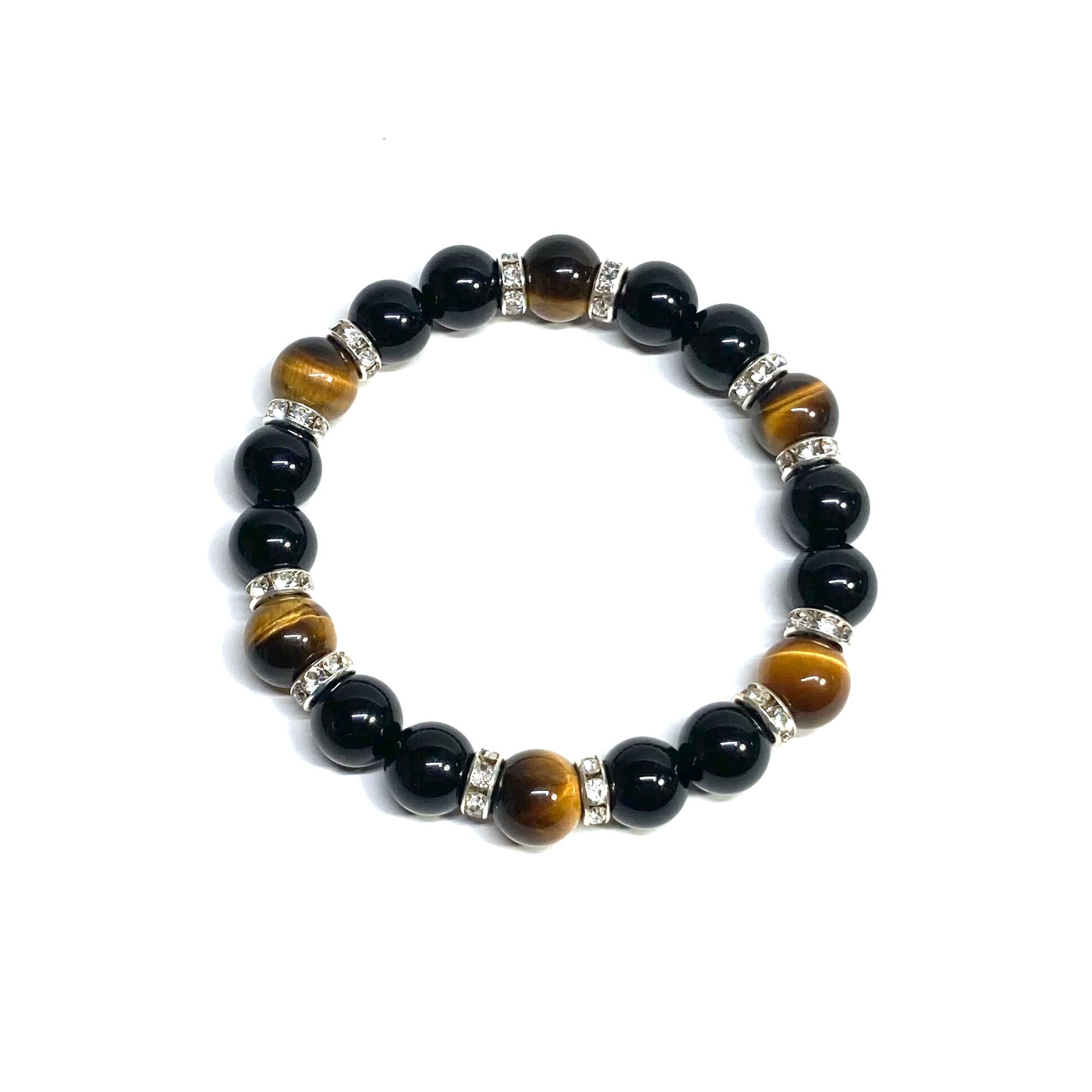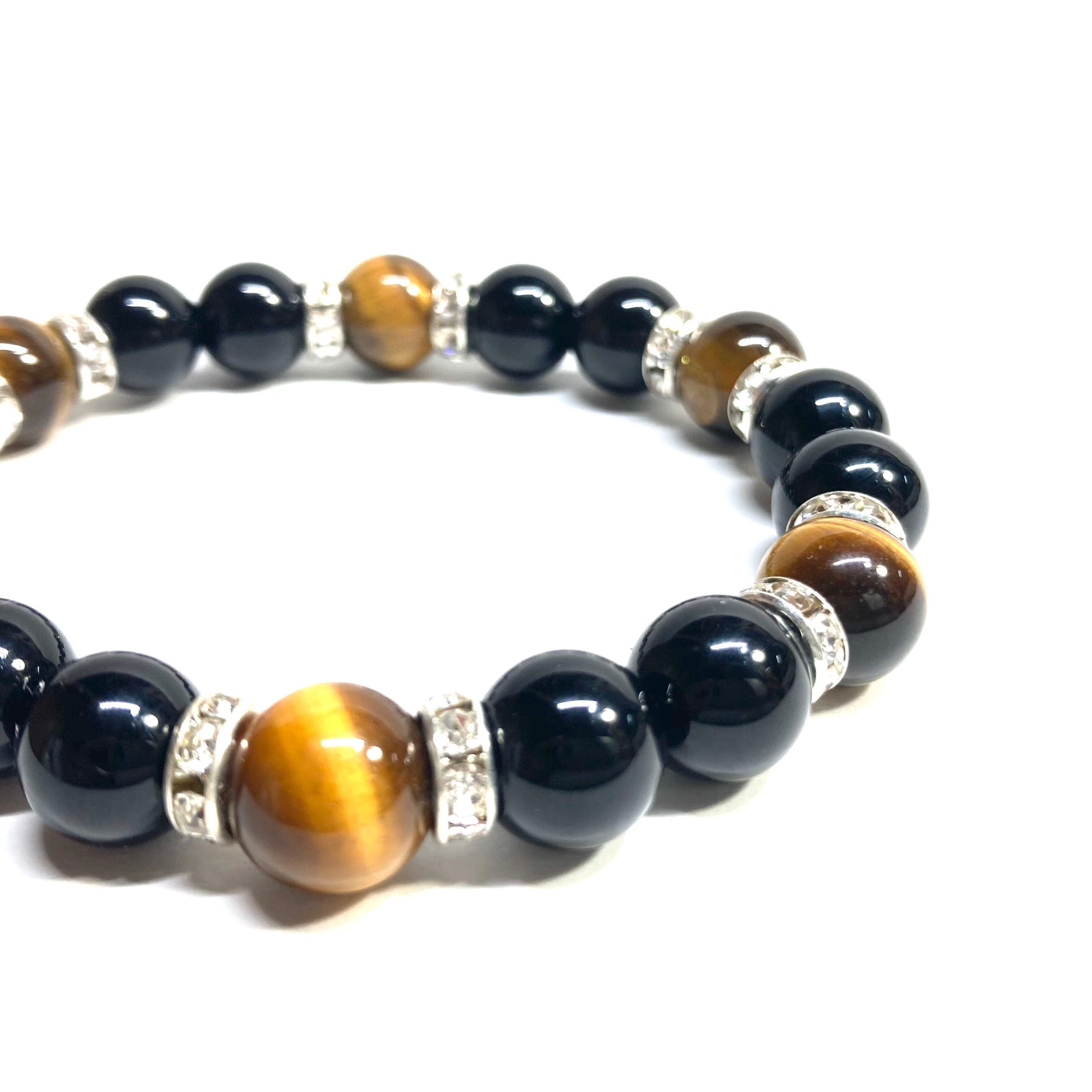こちらは、モリオンとタイガーアイを組み合わせたパワーストーンブレスレットです。間にはロンデルを挟み高級感あるデザインに仕上げております。石大きさは腕にも馴染みやすいように10mm玉で内周 約18cm(伸可能)です。 数に限りがございますので気になる方はお早めにどうぞ。