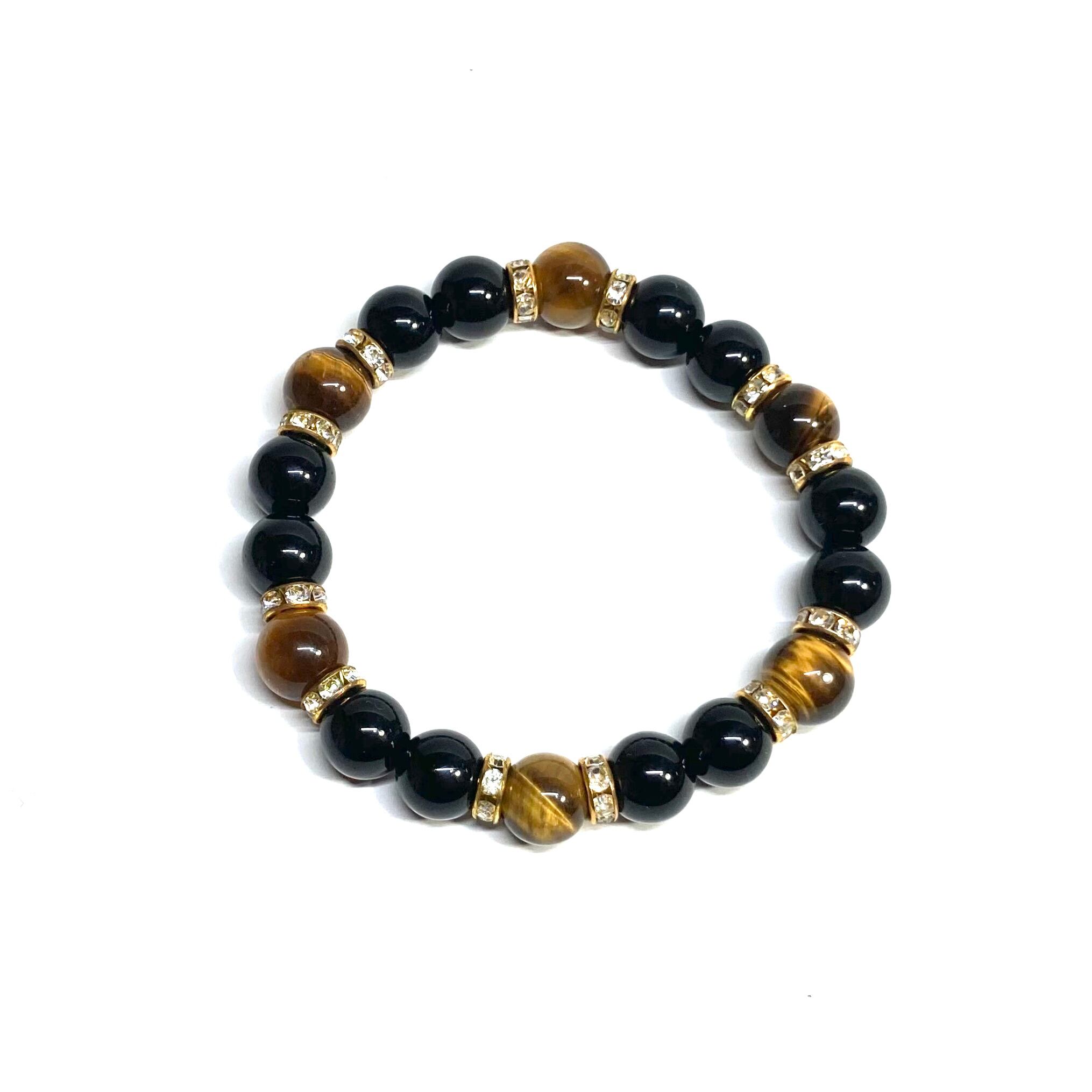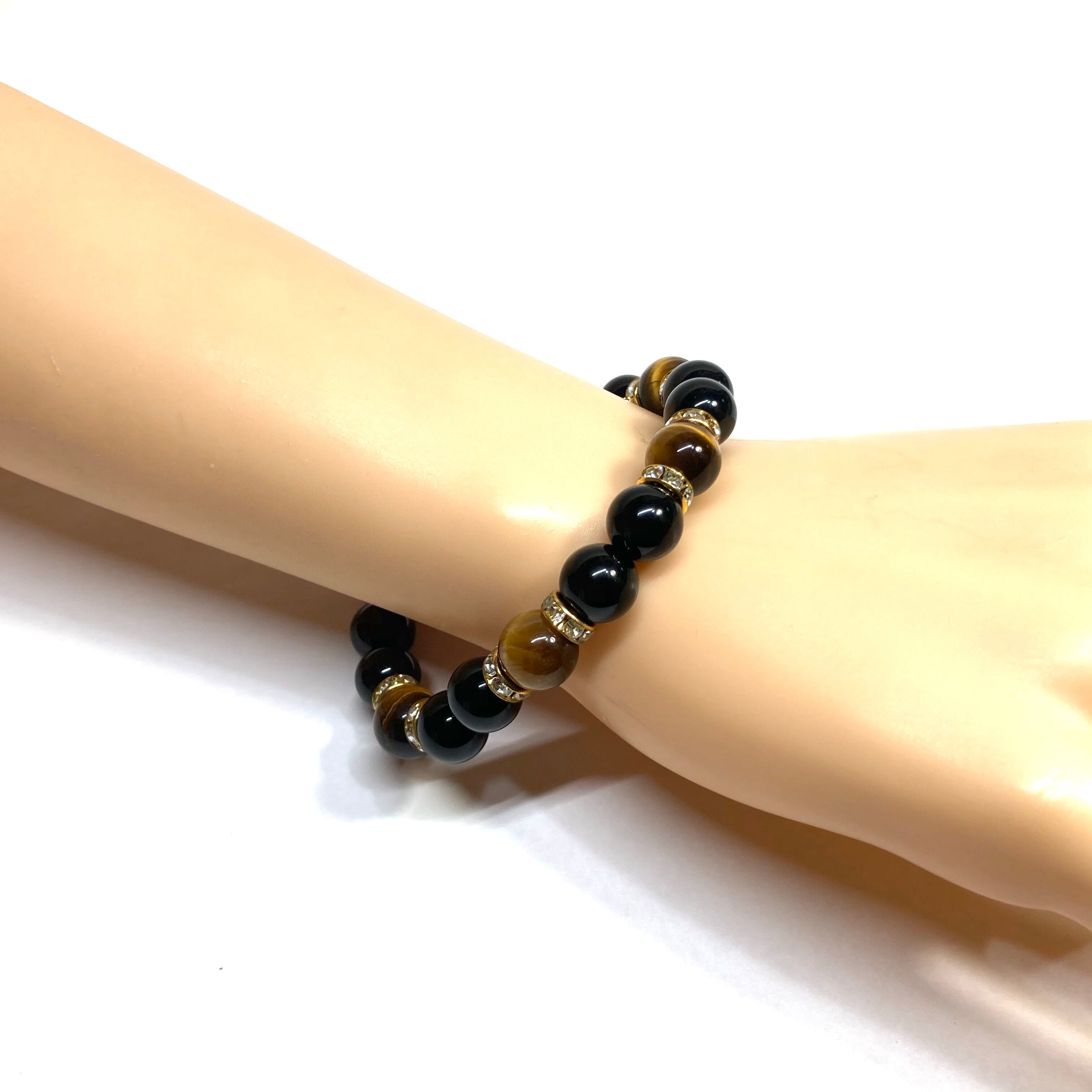 こちらは、モリオンとタイガーアイを組み合わせたパワーストーンブレスレットです。間にはロンデルを挟み高級感あるデザインに仕上げております。石大きさは腕にも馴染みやすいように10mm玉で内周 約18cm(伸可能)です。 数に限りがございますので気になる方はお早めにどうぞ。