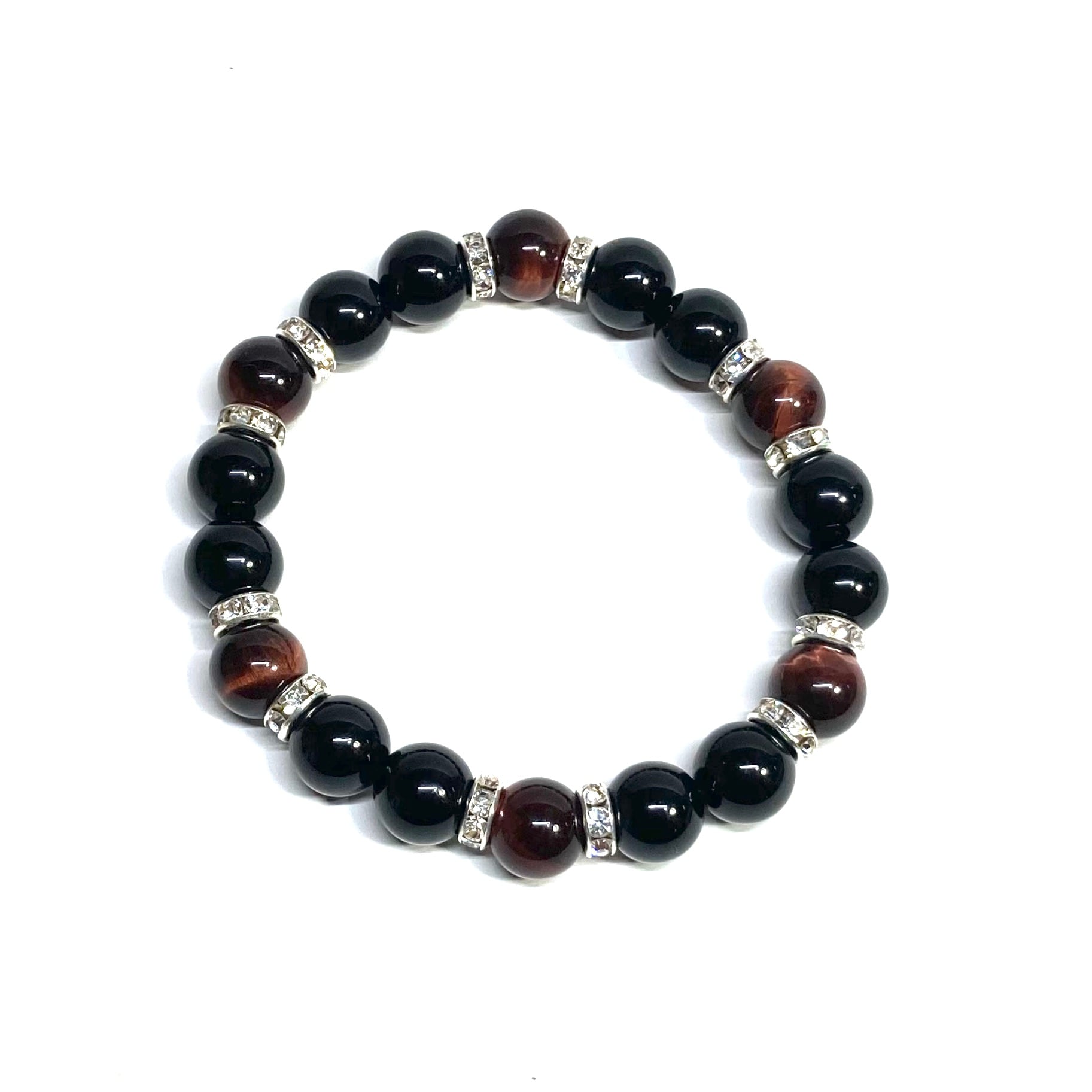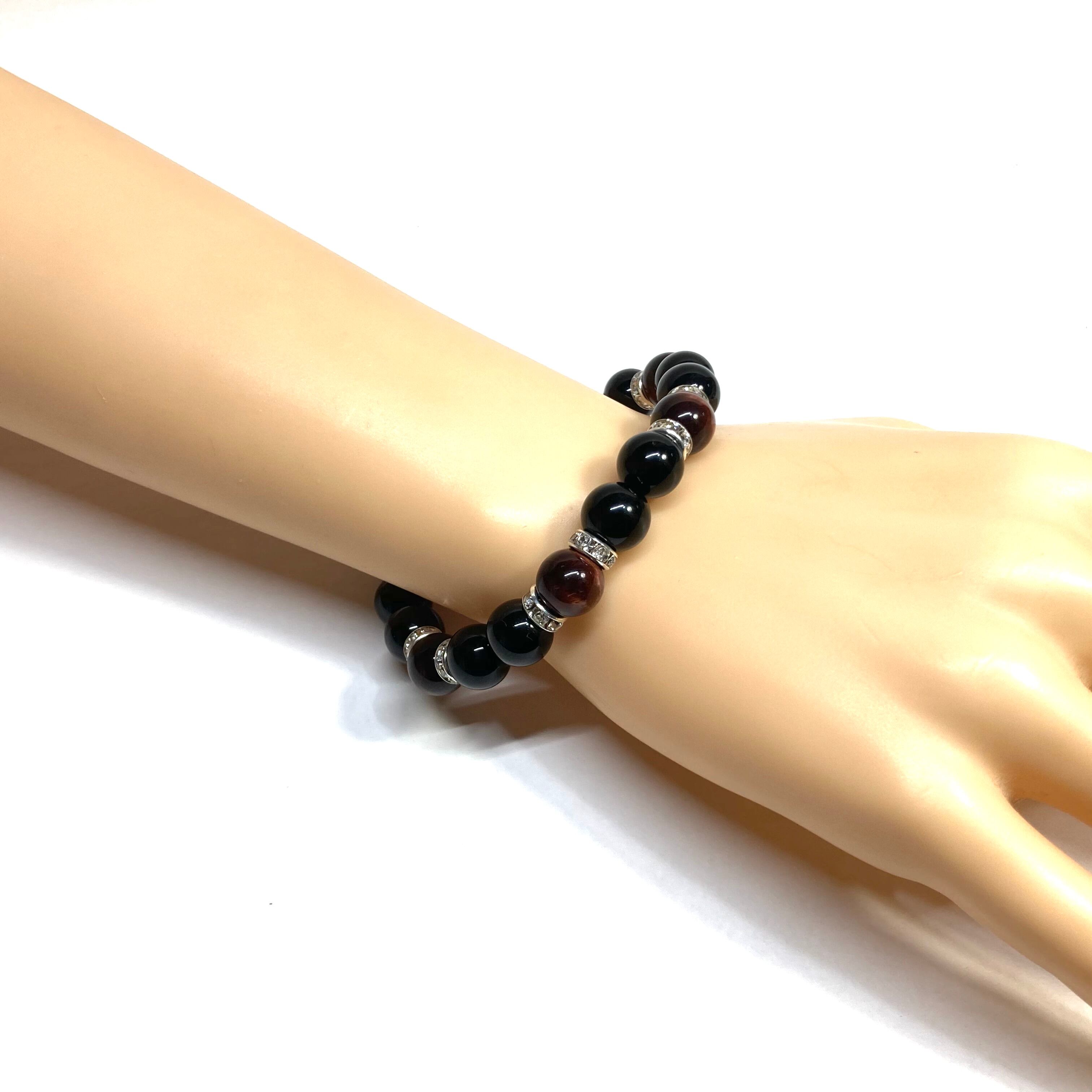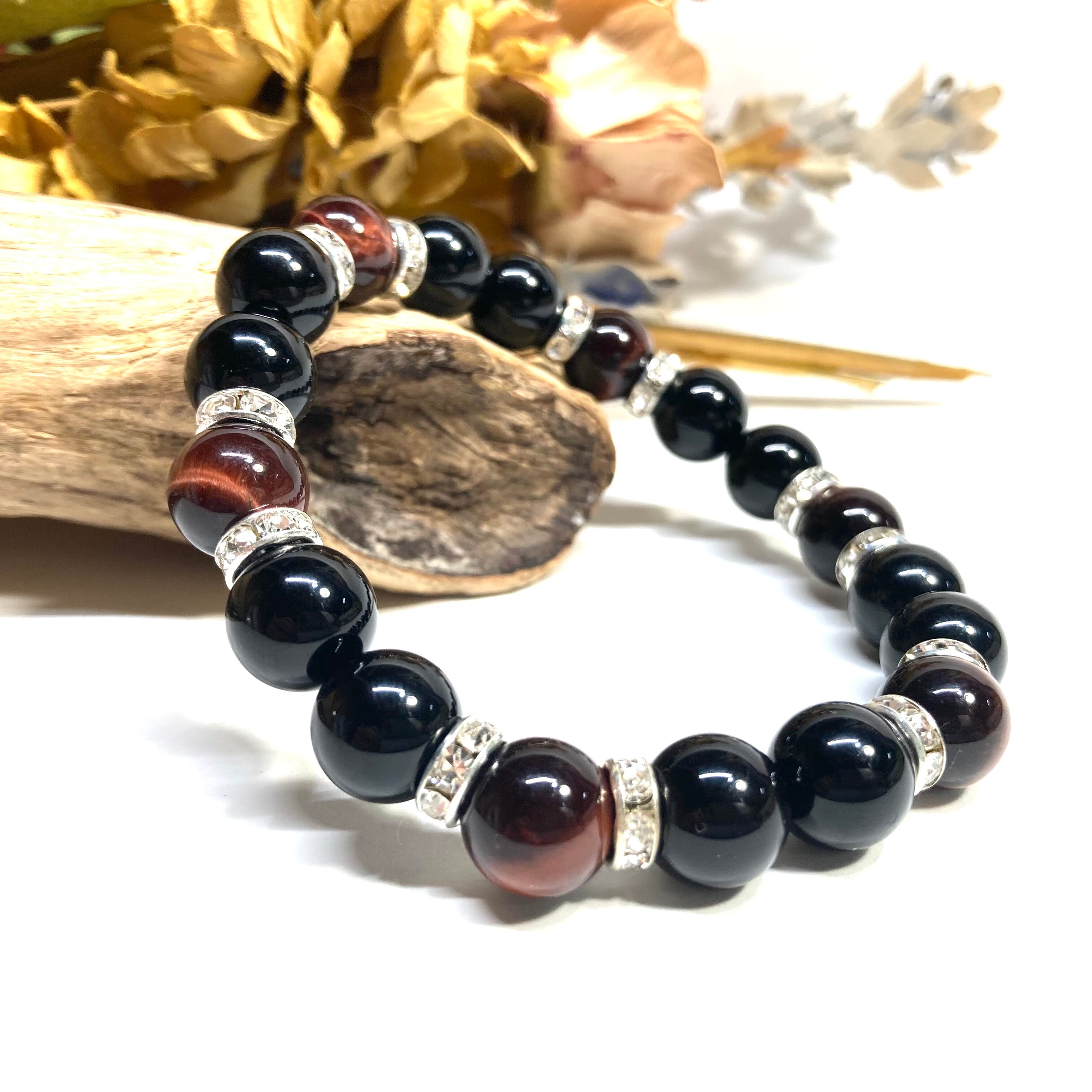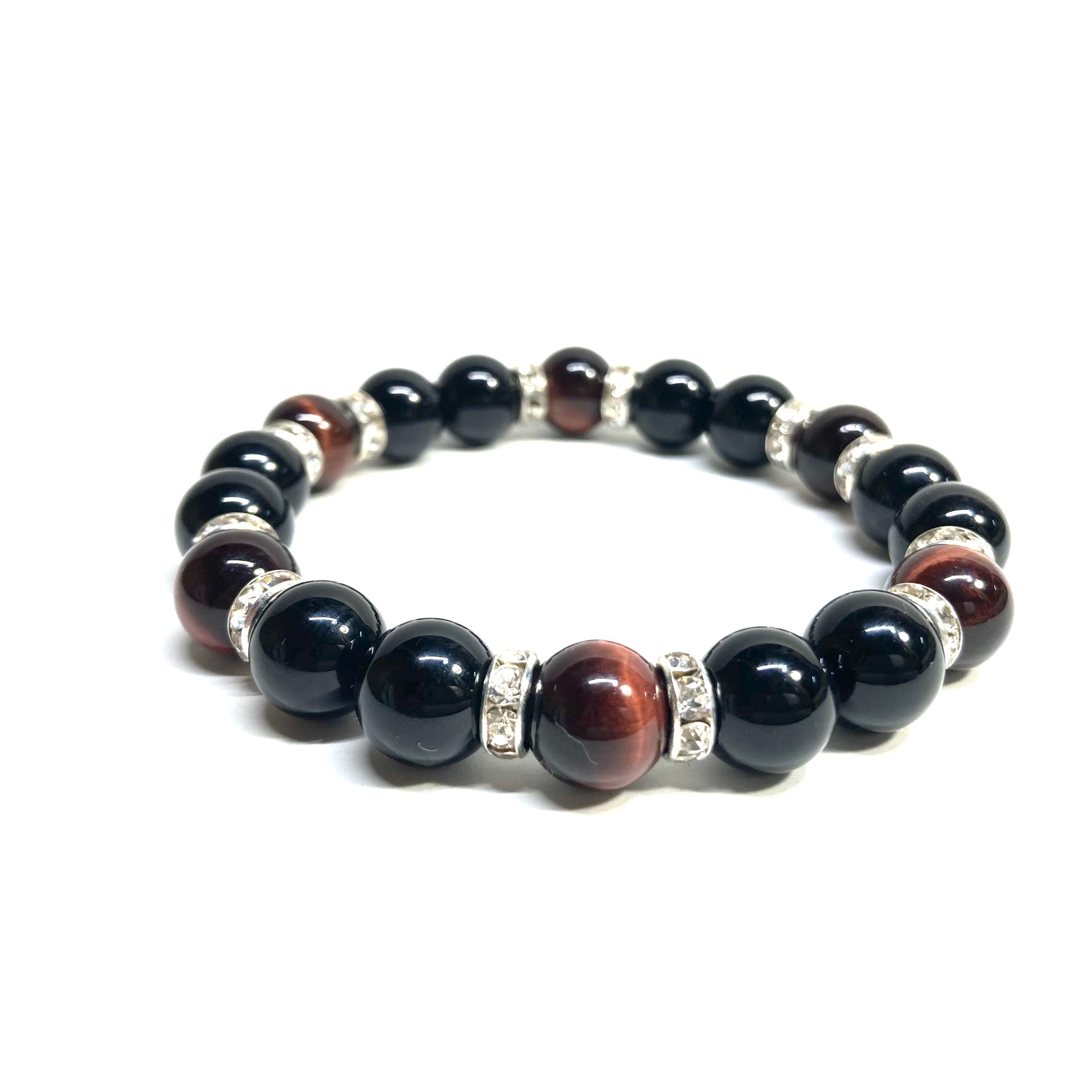 こちらは、モリオンとレッドタイガーアイを組み合わせたパワーストーンブレスレットです。間にはロンデルを挟み高級感あるデザインに仕上げております。石大きさは腕にも馴染みやすいように10mm玉で内径約18cm(伸可能)です。 数に限りがございますので気になる方はお早めにどうぞ。