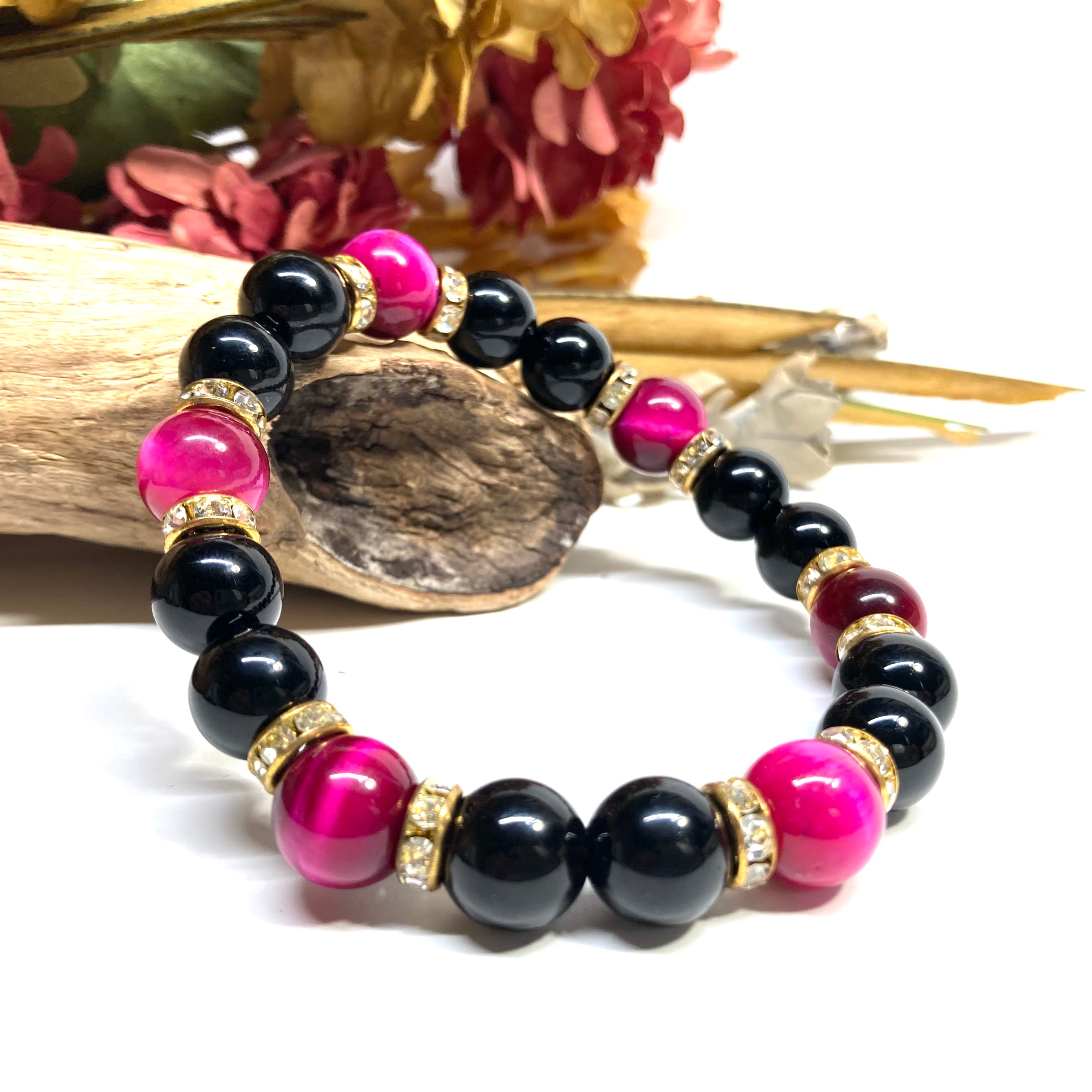 こちらは、モリオンとピンクタイガーアイを組み合わせたパワーストーンブレスレットです。間にはロンデルを挟み高級感あるデザインに仕上げております。石大きさは腕にも馴染みやすいように10mm玉で内径約18cm(伸可能)です。 数に限りがございますので気になる方はお早めにどうぞ。