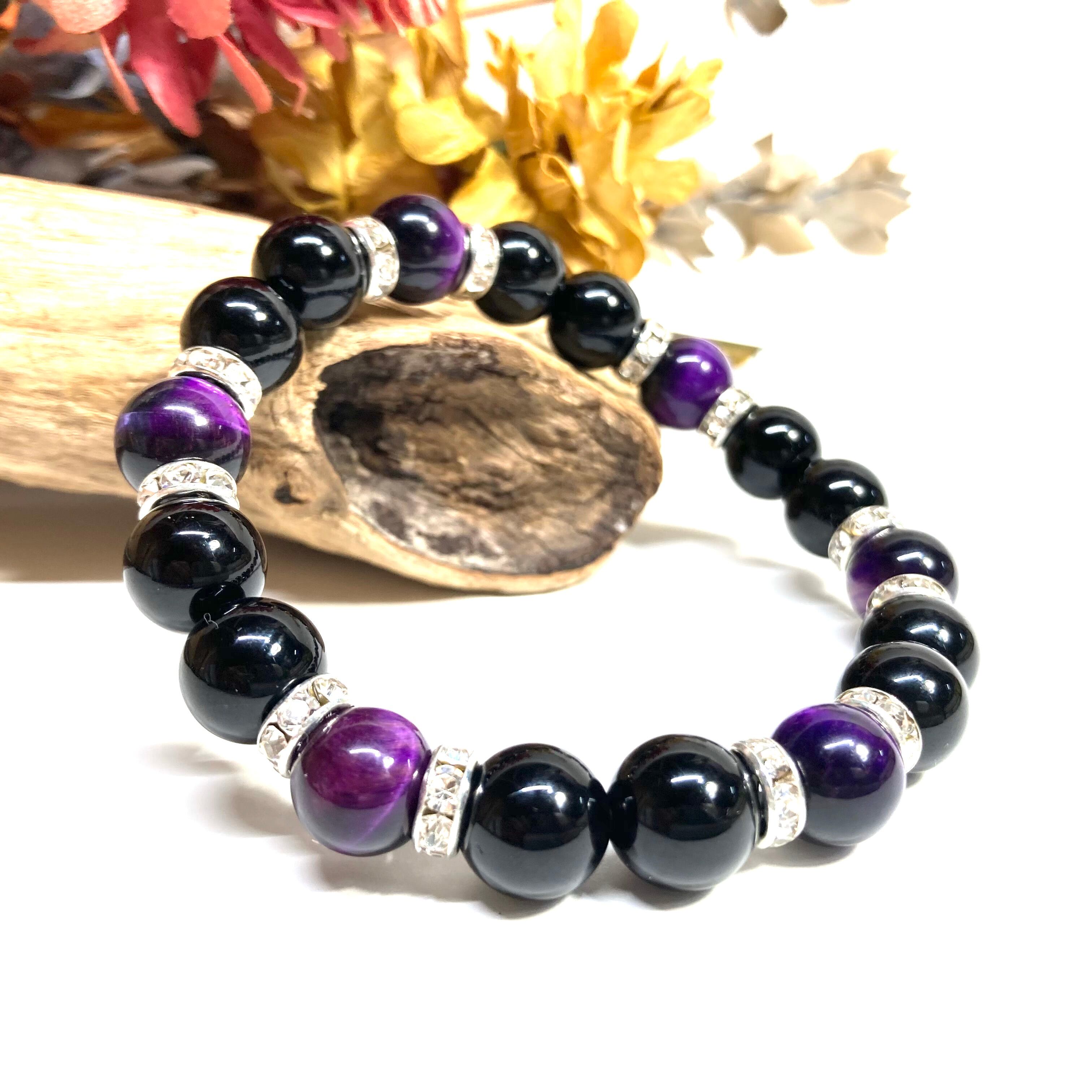 こちらは、モリオンとパープル タイガーアイを組み合わせたパワーストーンブレスレットです。間にはロンデルを挟み高級感あるデザインに仕上げております。石大きさは腕にも馴染みやすいように10mm玉で内径約18cm(伸可能)です。 数に限りがございますので気になる方はお早めにどうぞ。