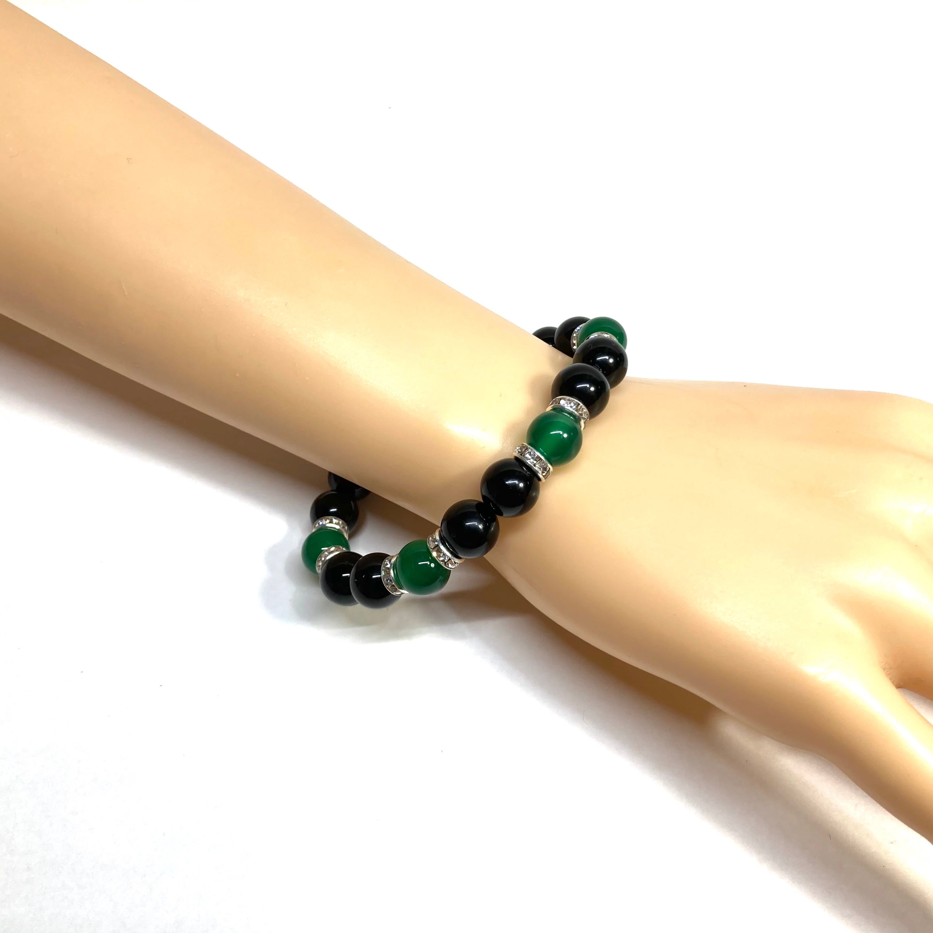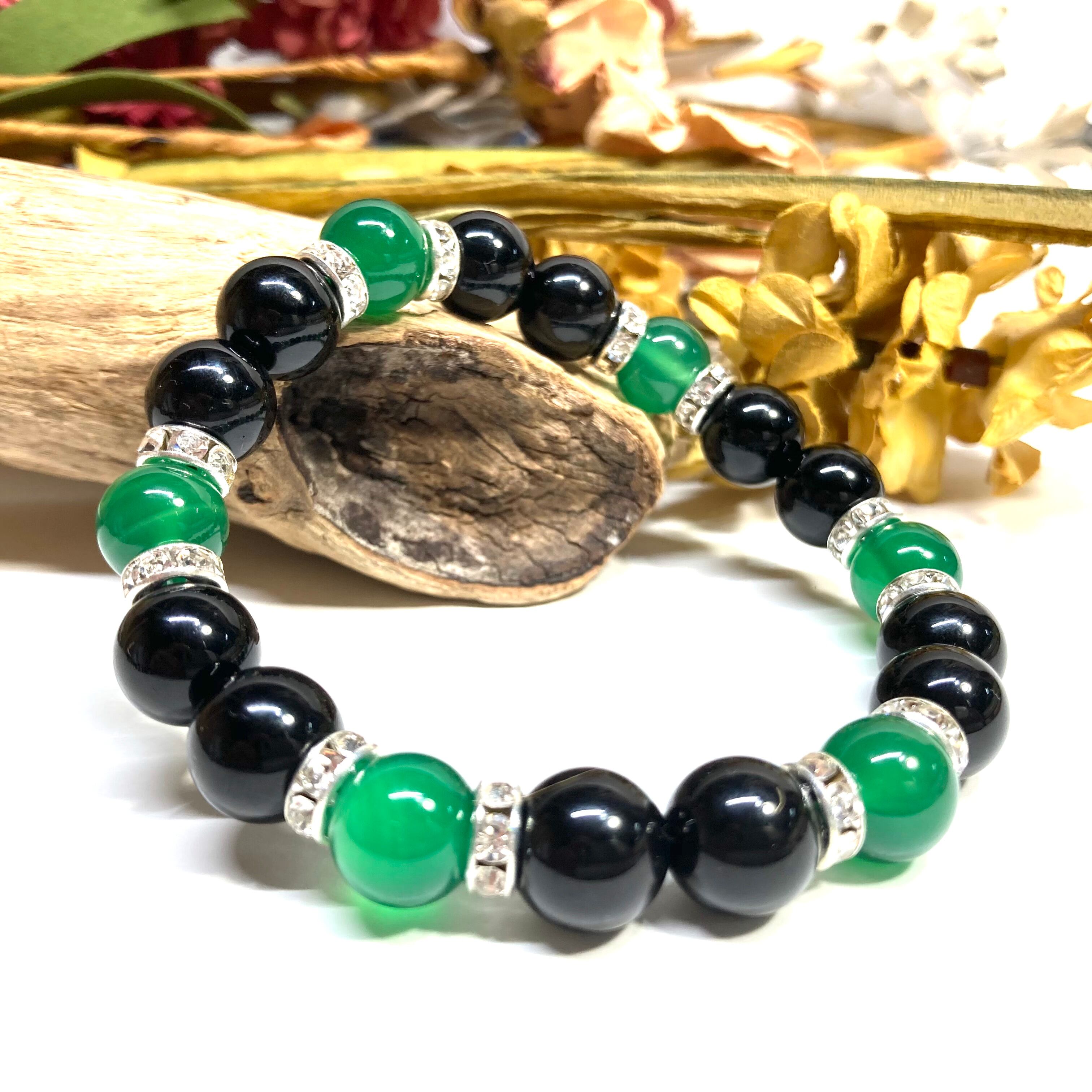 こちらは、モリオンと緑瑪瑙を組み合わせたパワーストーンブレスレットです。間にはロンデルを挟み高級感あるデザインに仕上げております。石大きさは腕にも馴染みやすいように10mm玉で内径約18cm(伸可能)です。 数に限りがございますので気になる方はお早めにどうぞ。