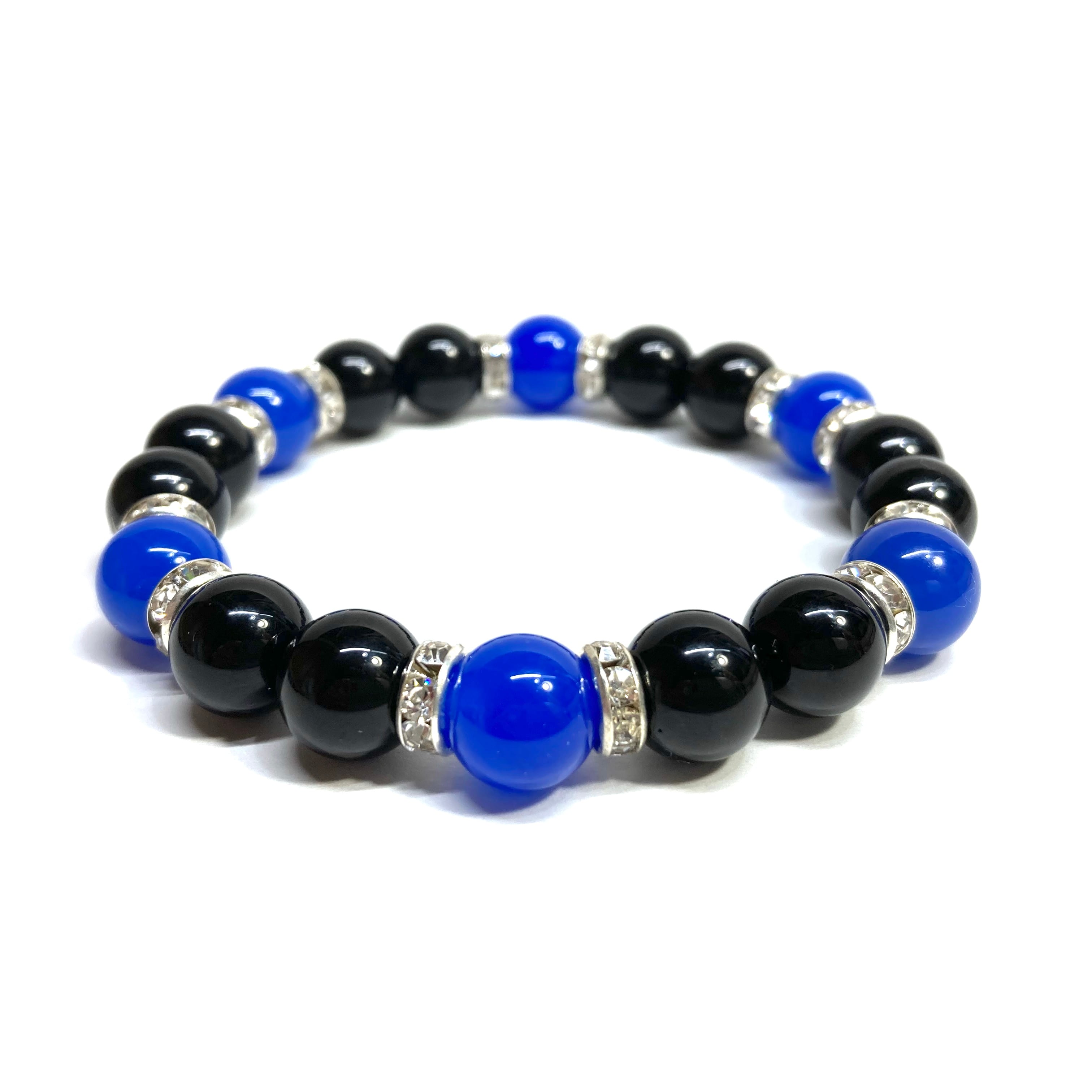 こちらは、モリオンと青瑪瑙を組み合わせたパワーストーンブレスレットです。間にはロンデルを挟み高級感あるデザインに仕上げております。石大きさは腕にも馴染みやすいように10mm玉で内径約18cm(伸可能)です。 数に限りがございますので気になる方はお早めにどうぞ。