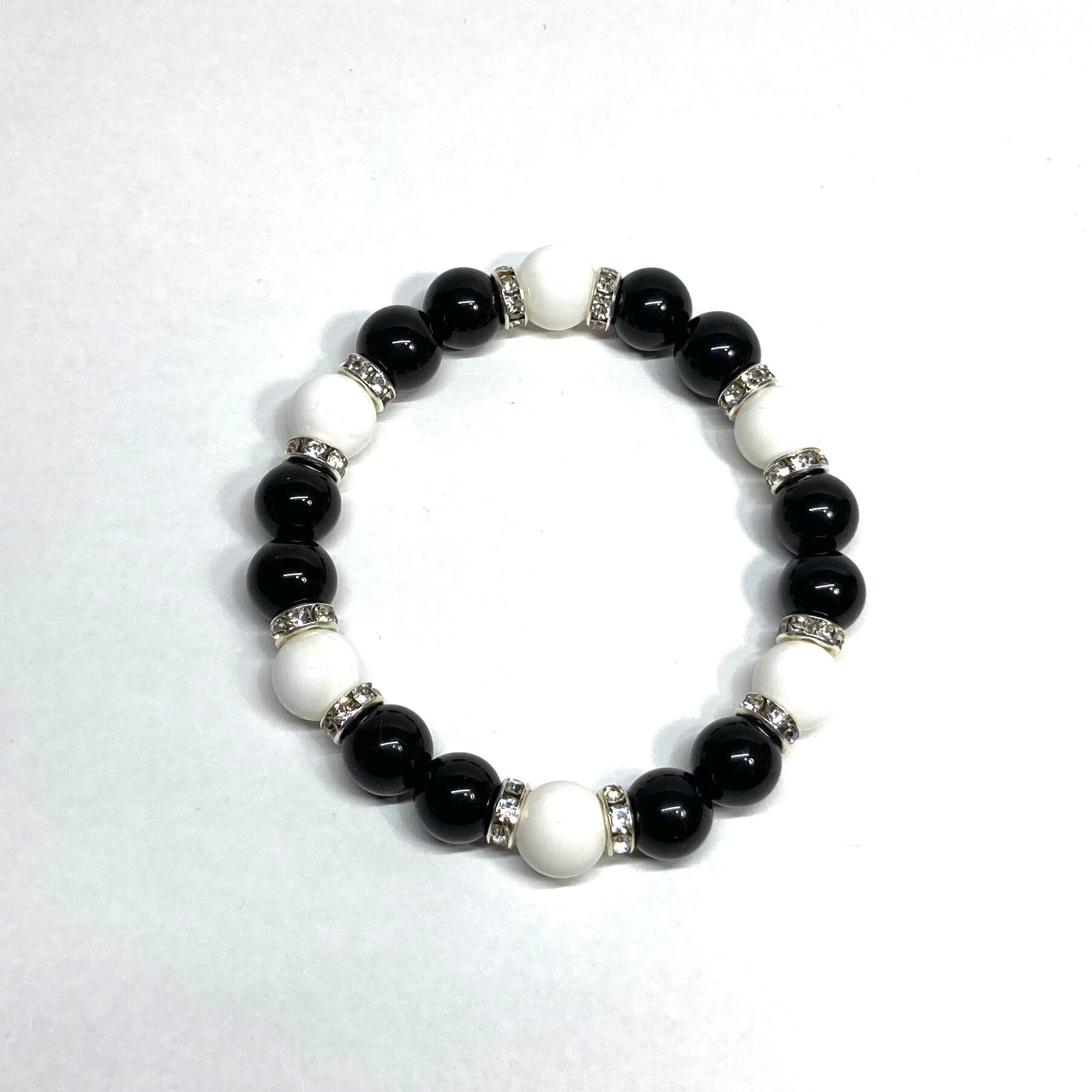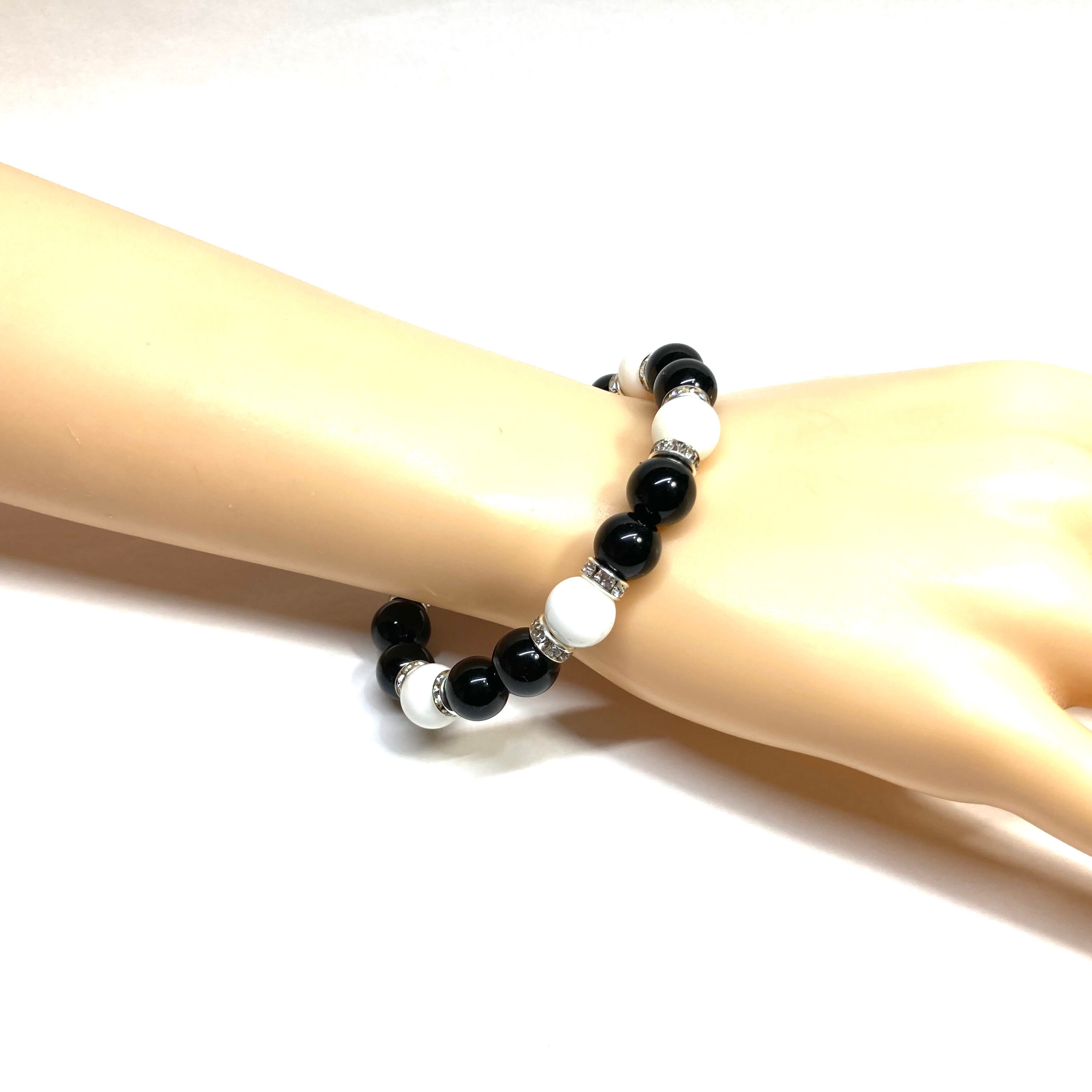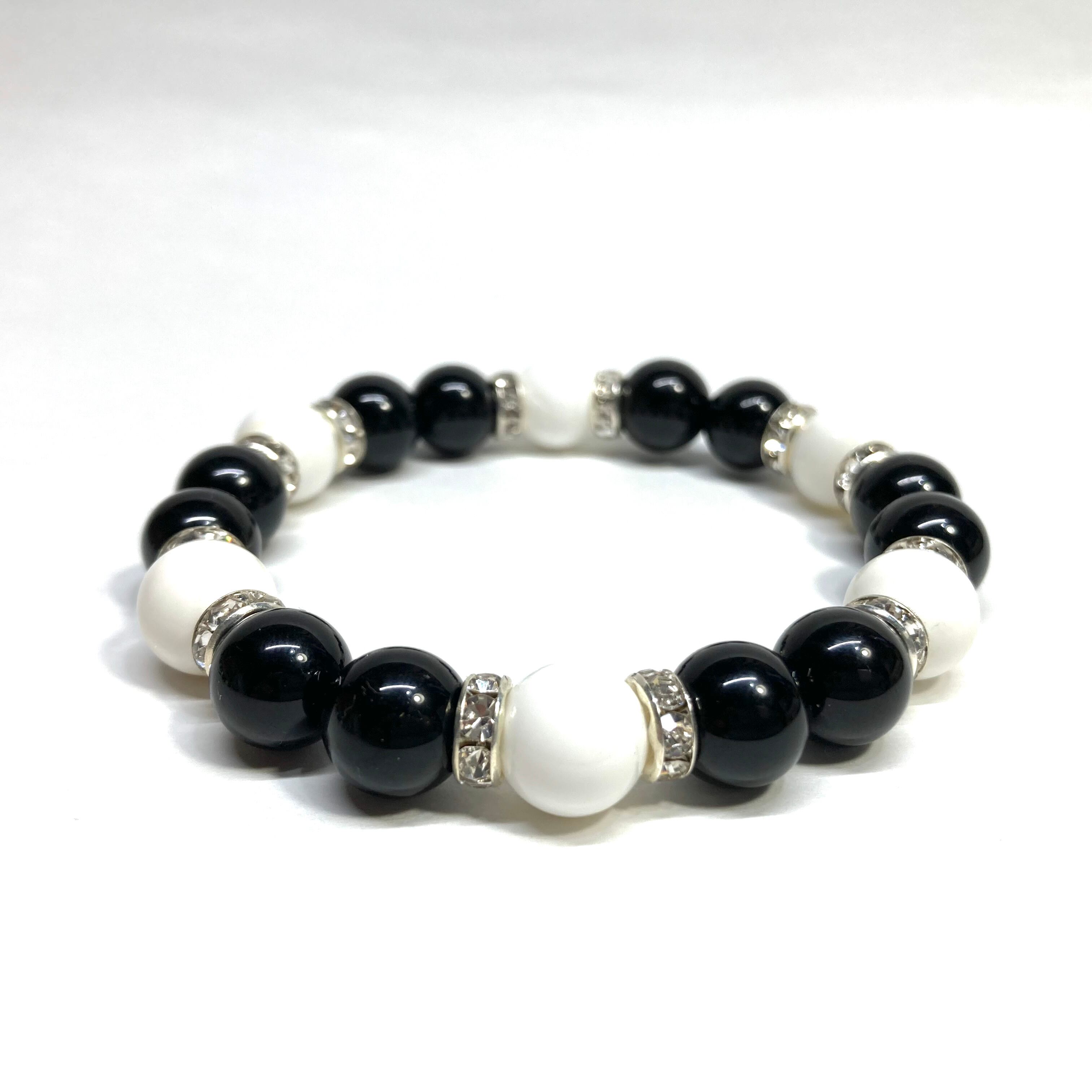 こちらは、モリオンとホワイトオニキスを組み合わせたパワーストーンブレスレットです。間にはロンデルを挟み高級感あるデザインに仕上げております。石大きさは腕にも馴染みやすいように10mm玉で内径約18cm(伸可能)です。 数に限りがございますので気になる方はお早めにどうぞ。