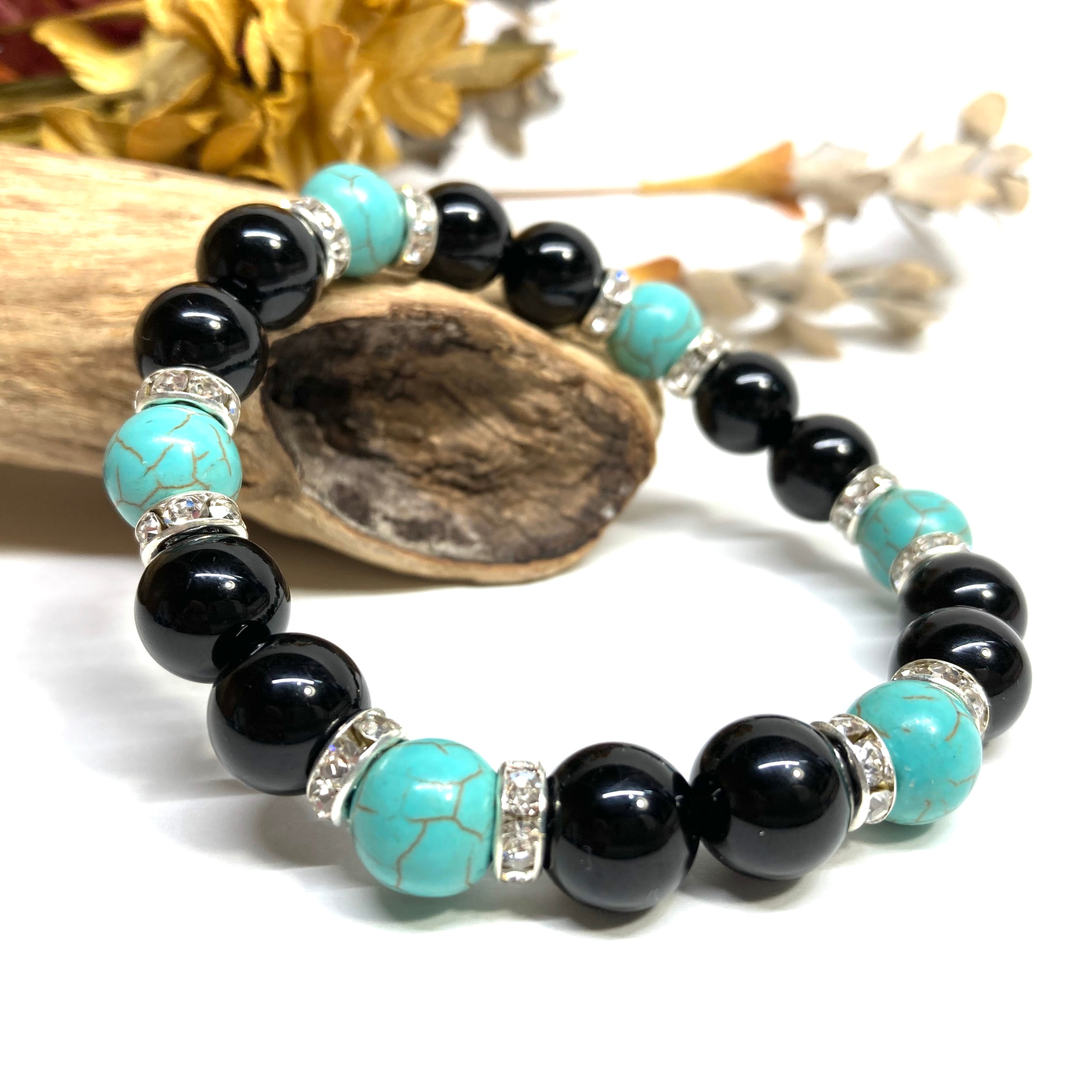 こちらは、モリオンとターコイズを組み合わせたパワーストーンブレスレットです。間にはロンデルを挟み高級感あるデザインに仕上げております。石大きさは腕にも馴染みやすいように10mm玉で内径約18cm(伸可能)です。 数に限りがございますので気になる方はお早めにどうぞ。