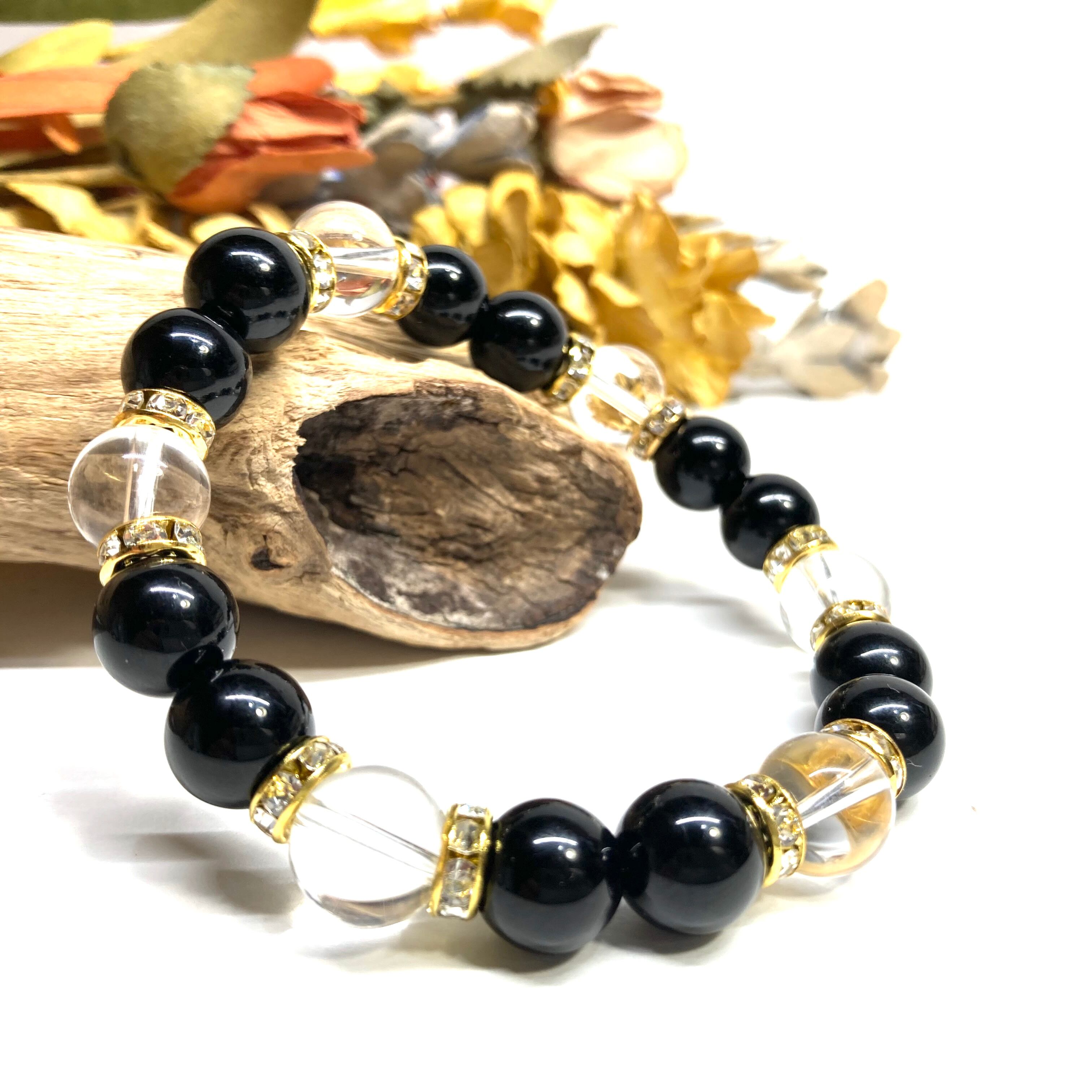 モリオン&水晶 パワーストーン ブレスレット 天然石ブレス (ゴールド) 10mm メンズ・レディース 厄除け 開運 願望成就 魔よけ お守り ☆