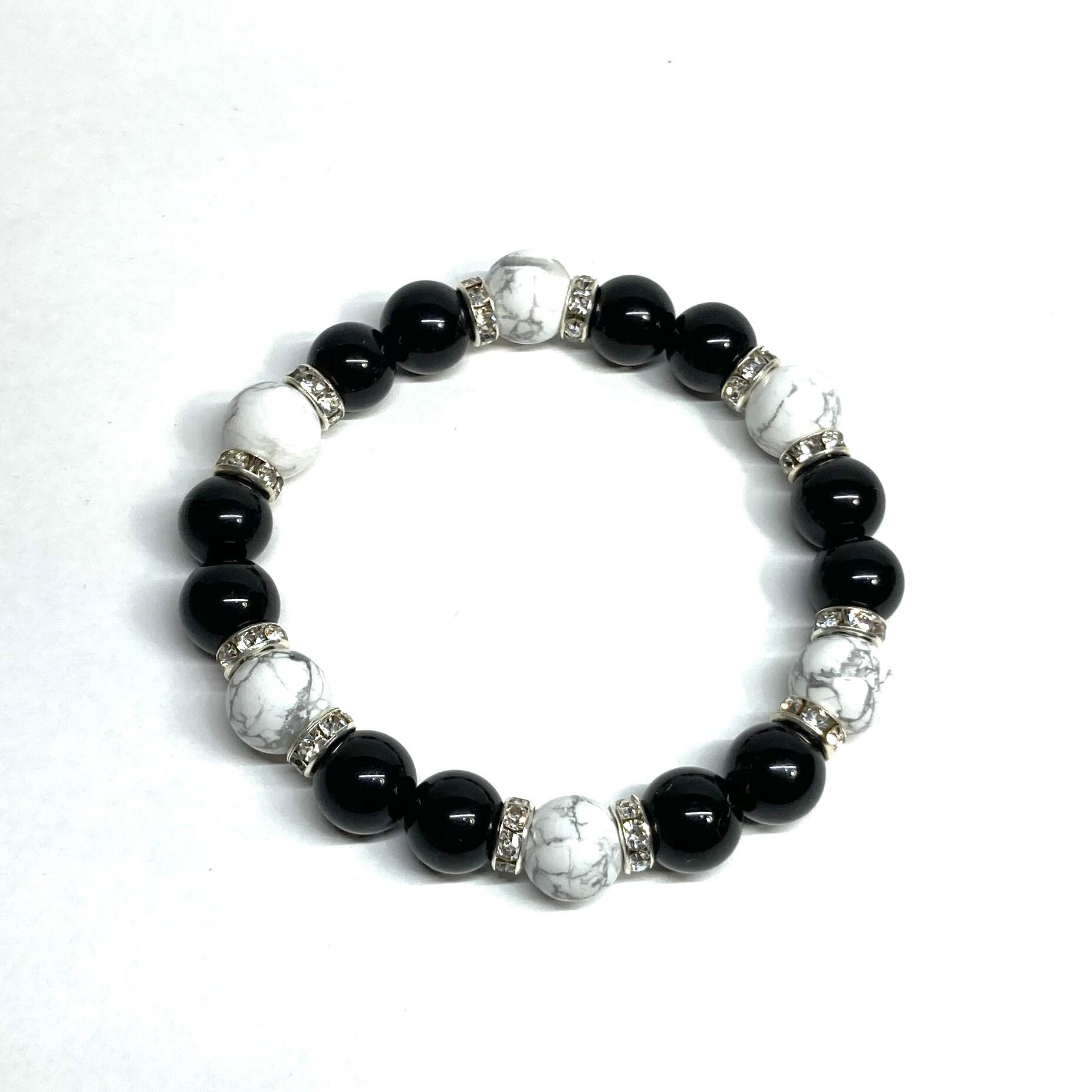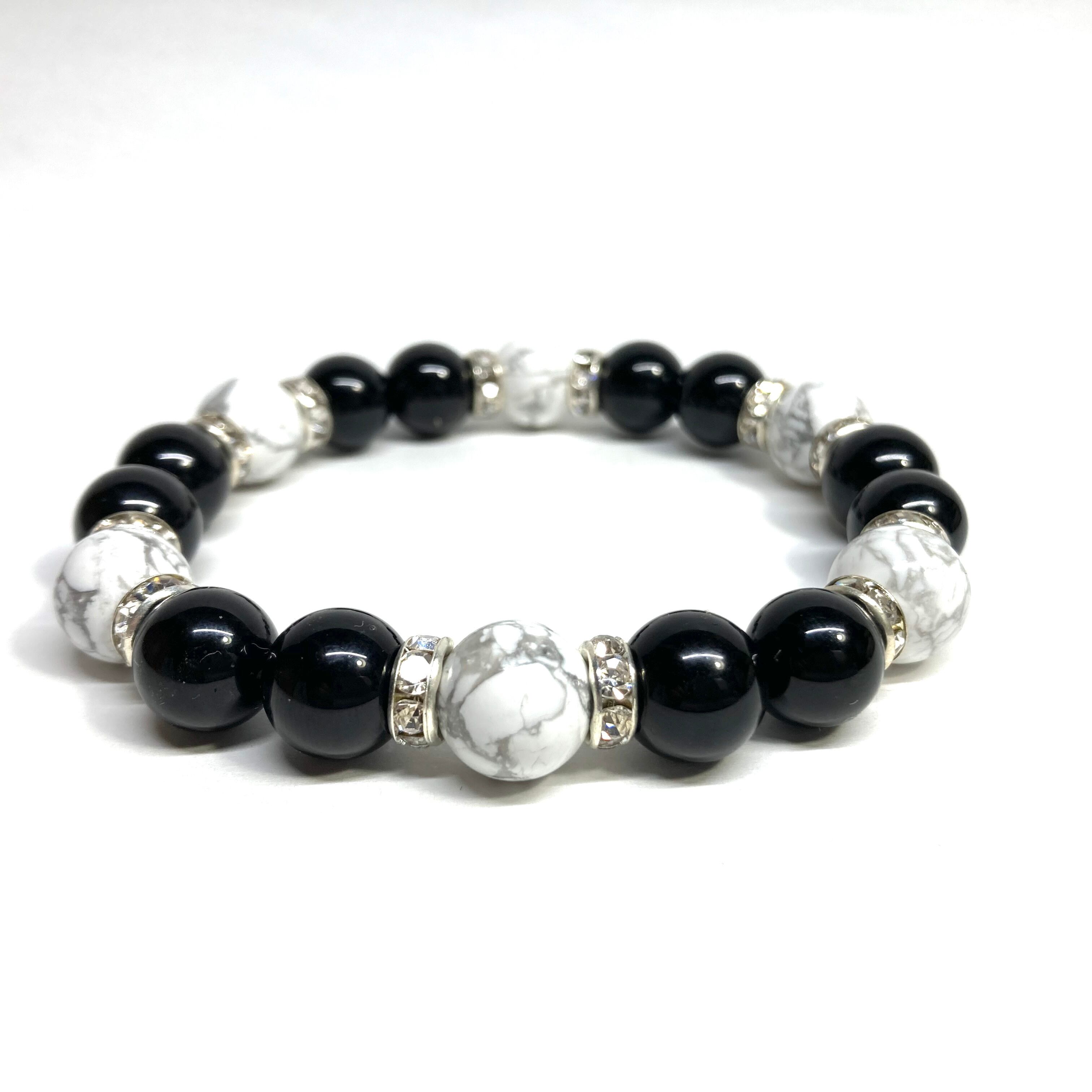 こちらは、モリオンとハウライトを組み合わせたパワーストーンブレスレットです。間にはロンデルを挟み高級感あるデザインに仕上げております。石大きさは腕にも馴染みやすいように10mm玉で内径約18cm(伸可能)です。 数に限りがございますので気になる方はお早めにどうぞ。