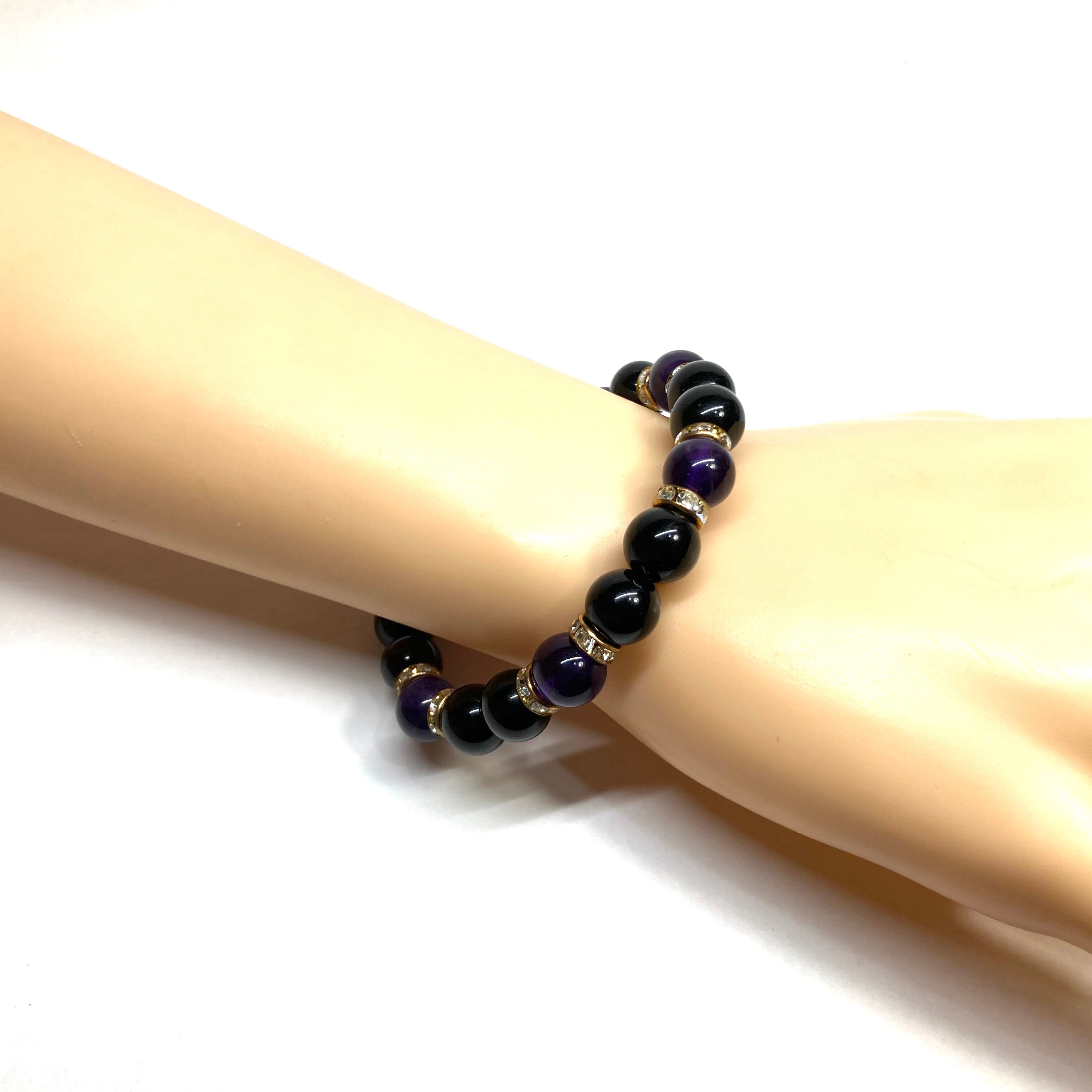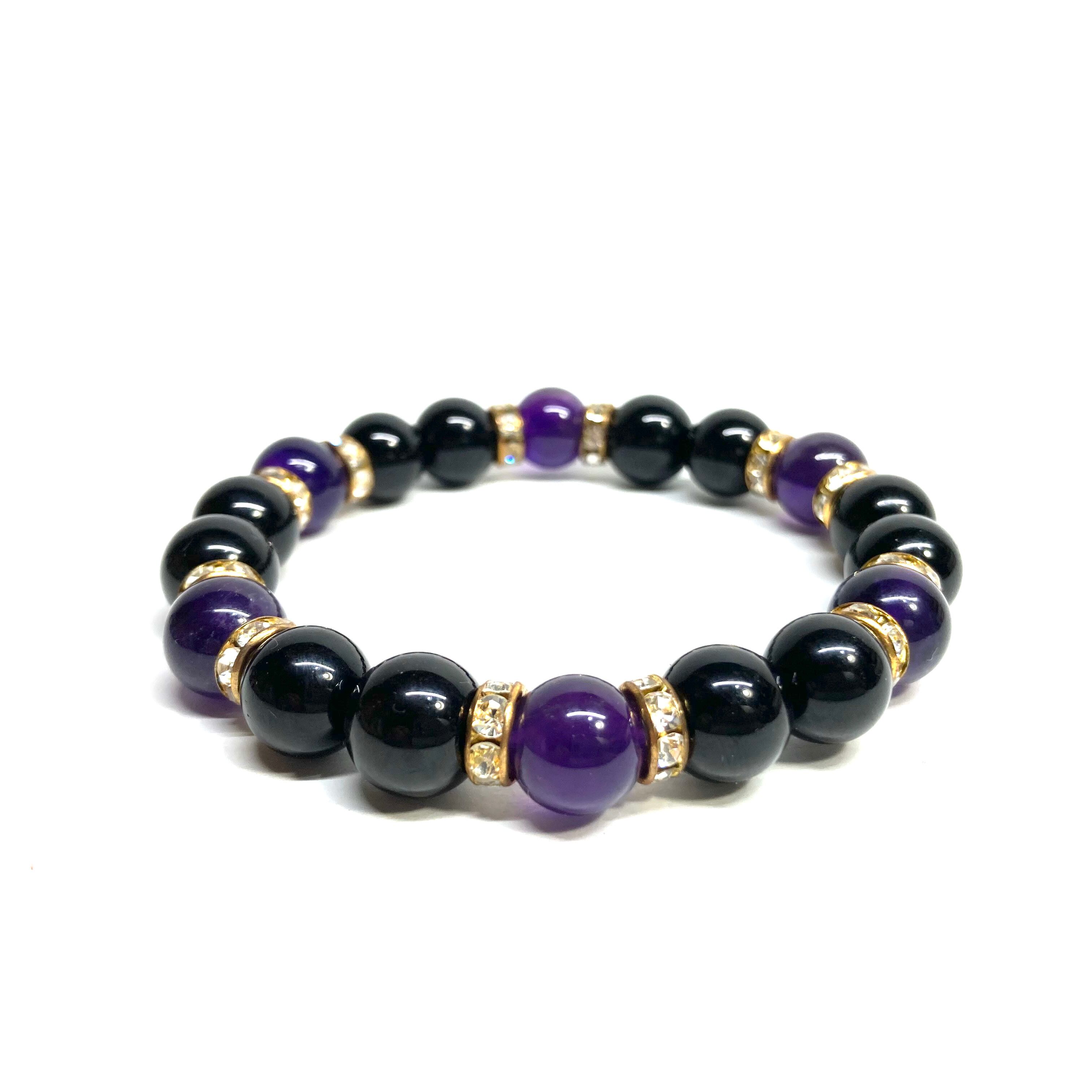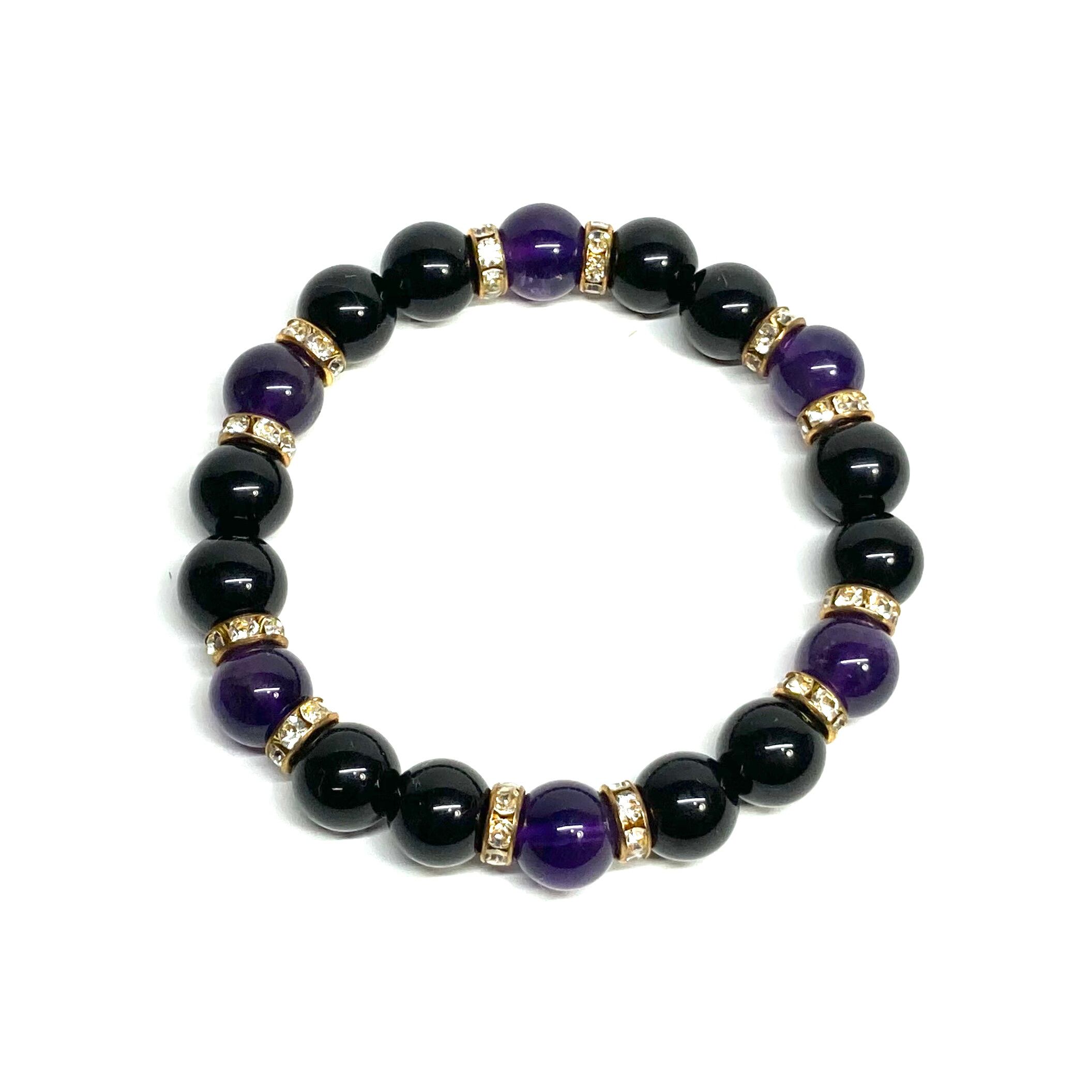 こちらは、モリオンとアメジストを組み合わせたパワーストーンブレスレットです。間にはロンデルを挟み高級感あるデザインに仕上げております。石大きさは腕にも馴染みやすいように10mm玉で内径約18cm(伸可能)です。 数に限りがございますので気になる方はお早めにどうぞ。