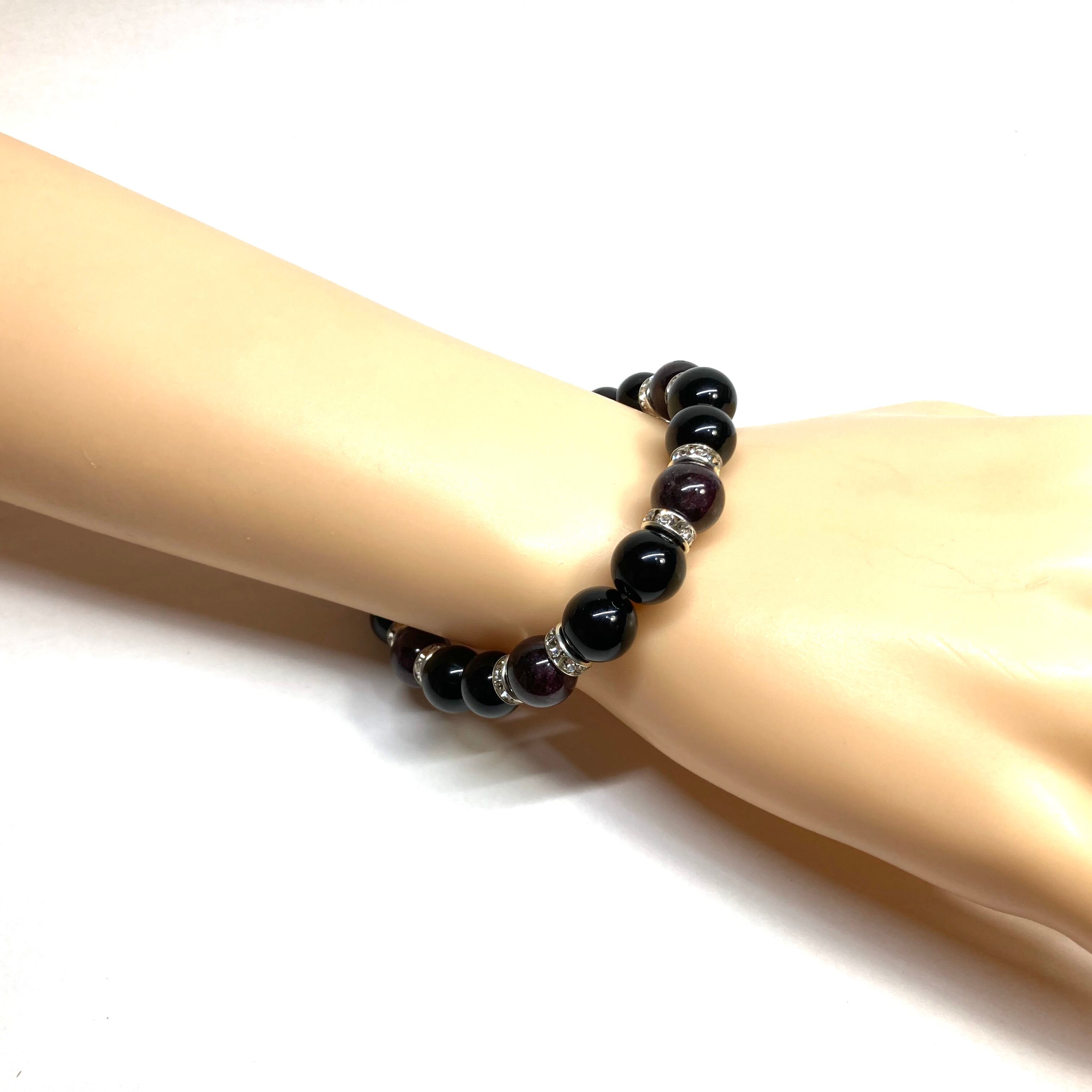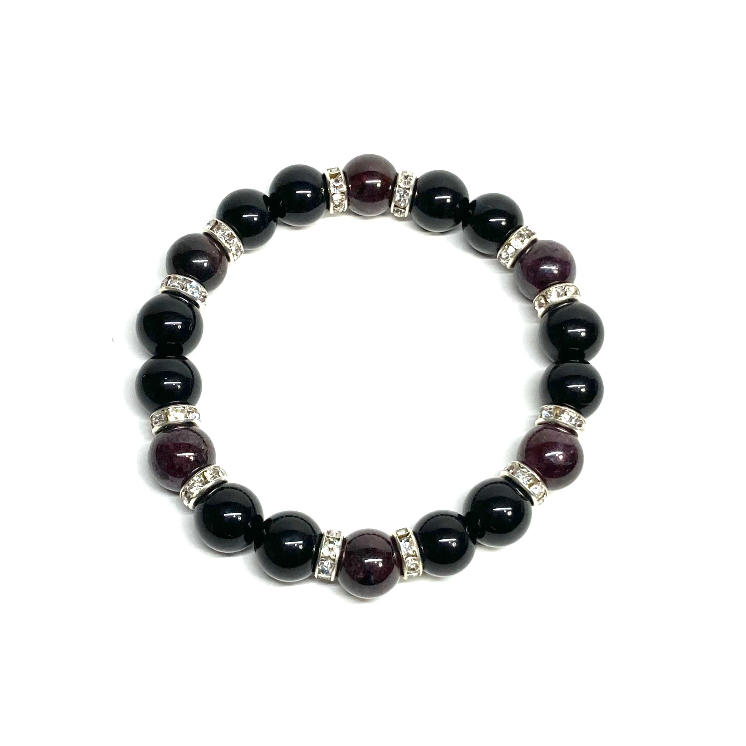 こちらは、モリオンとガーネットを組み合わせたパワーストーンブレスレットです。間にはロンデルを挟み高級感あるデザインに仕上げております。石大きさは腕にも馴染みやすいように10mm玉で内径約18cm(伸可能)です。 数に限りがございますので気になる方はお早めにどうぞ。