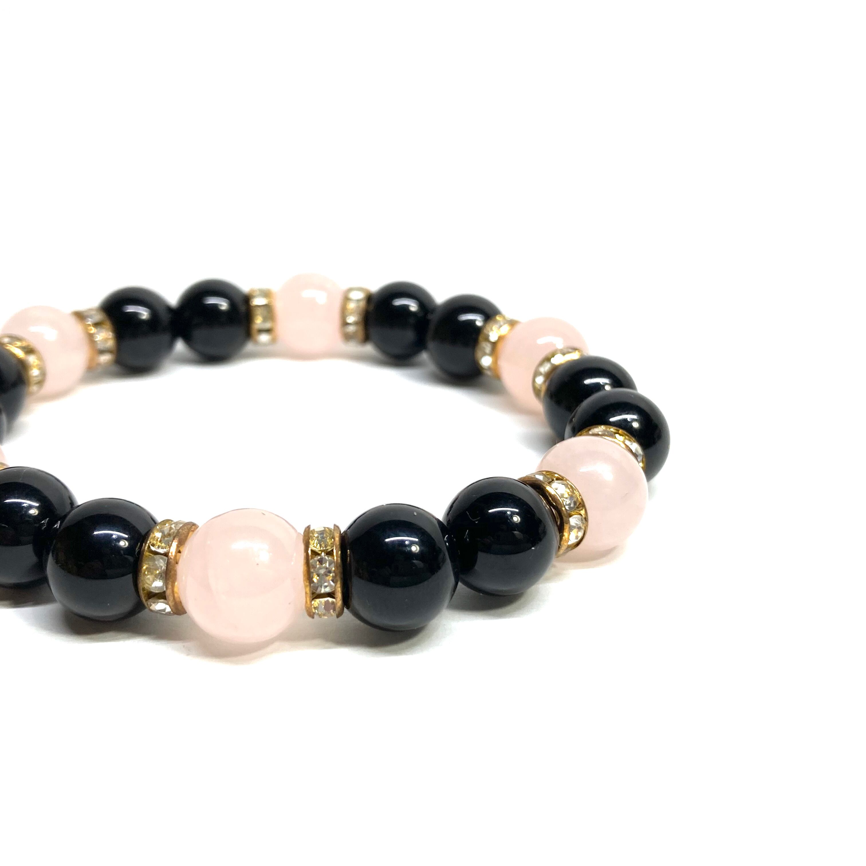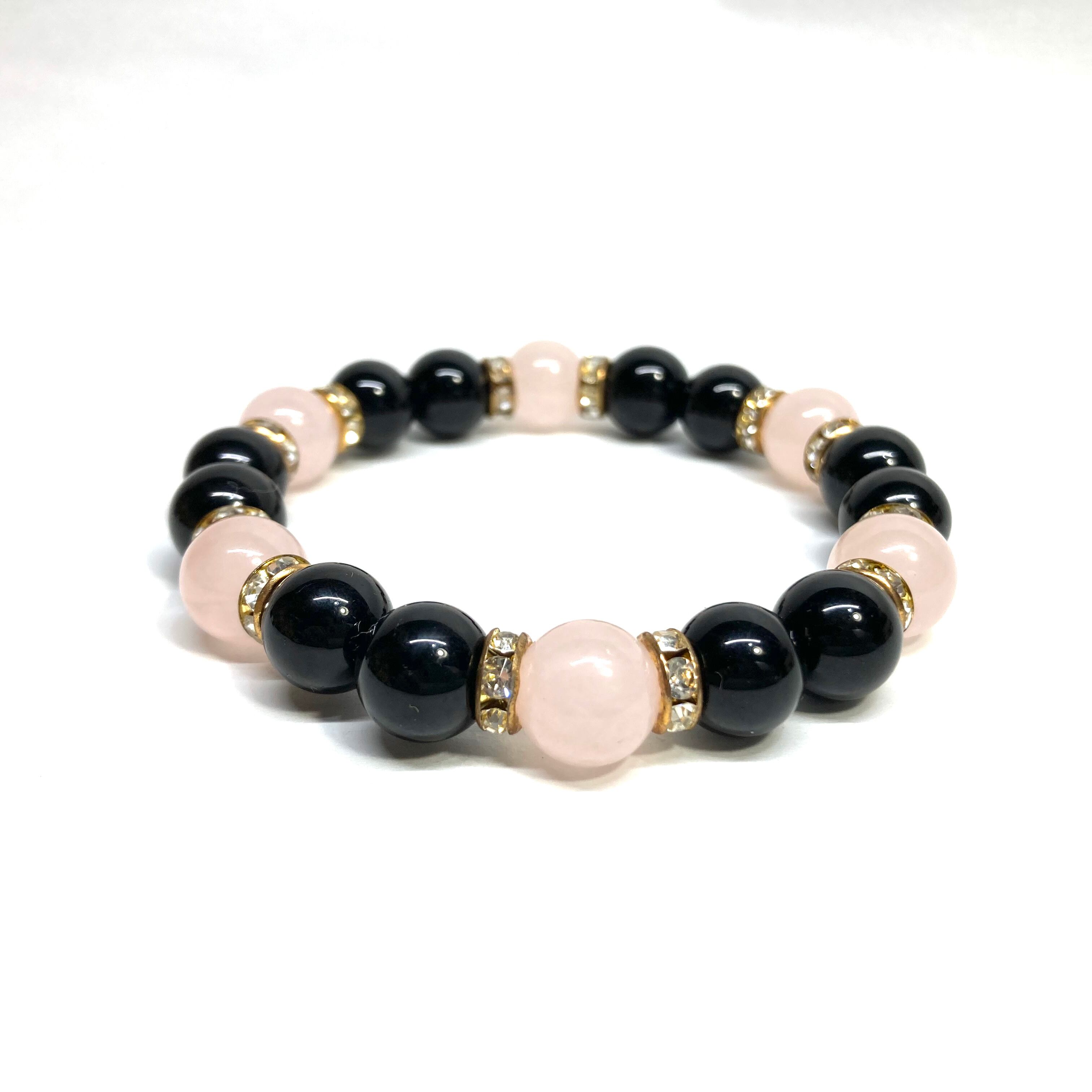 こちらは、モリオンとローズクォーツを組み合わせたパワーストーンブレスレットです。間にはロンデルを挟み高級感あるデザインに仕上げております。石大きさは腕にも馴染みやすいように10mm玉で内径約18cm(伸可能)です。 数に限りがございますので気になる方はお早めにどうぞ。